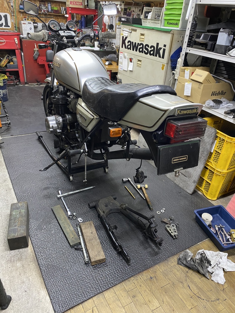 スイングアームを外します。スイングアームは鉄S1スイングアームに変更するので、ノーマルスイングアームを加工して製作します。