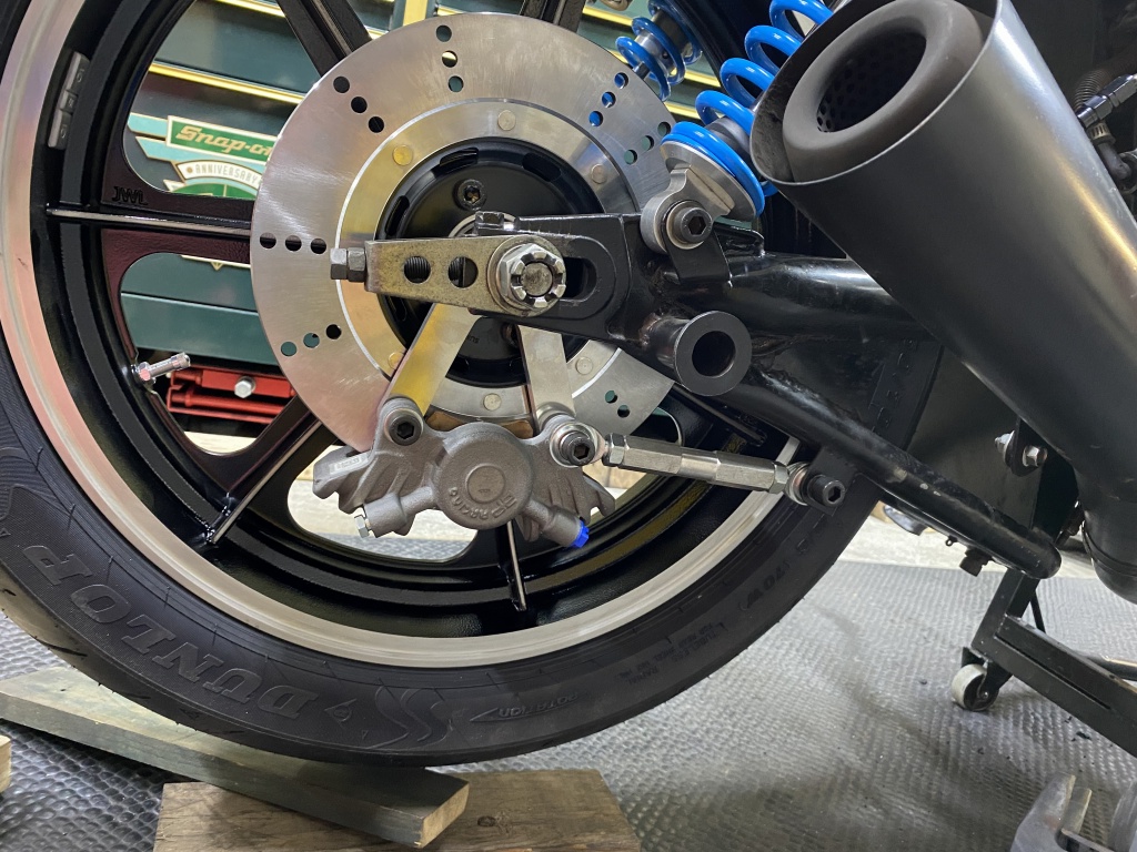 リヤキャリパー周りを仮組。トルクロッドも現車合わせで製作。