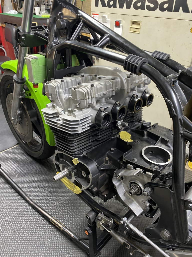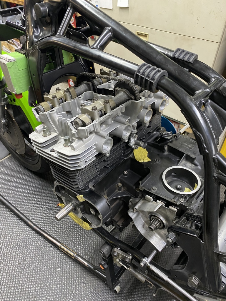 バルタイ調整とバルブとピストンのクリアランス確認が終わったので、いよいよヘッドを組み込みます。