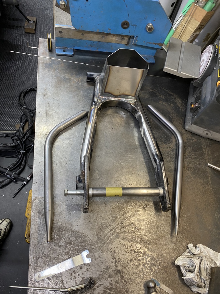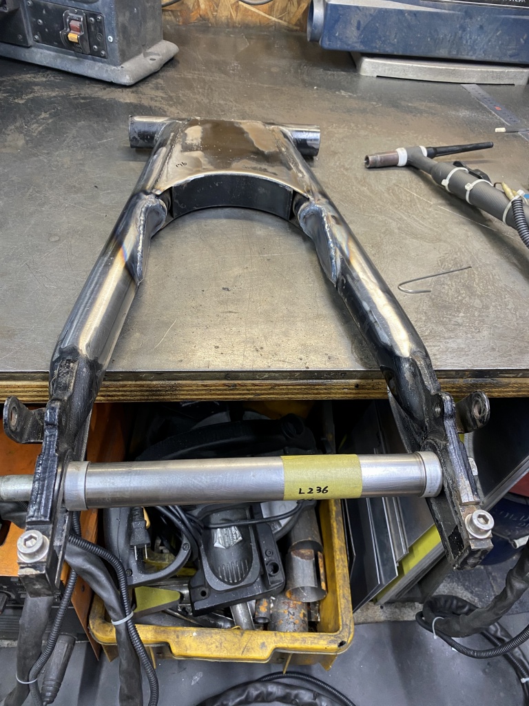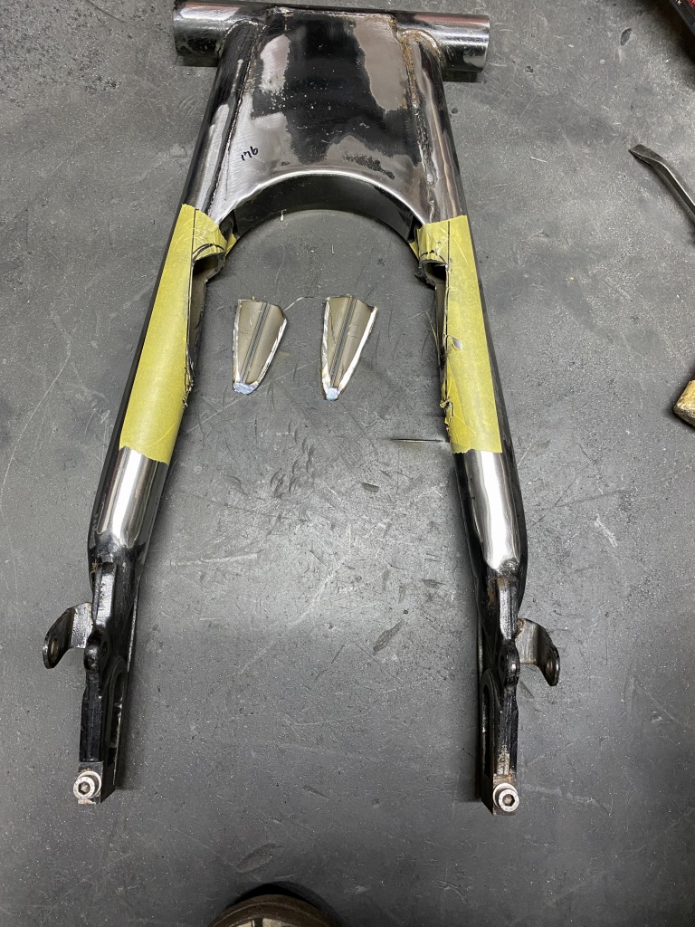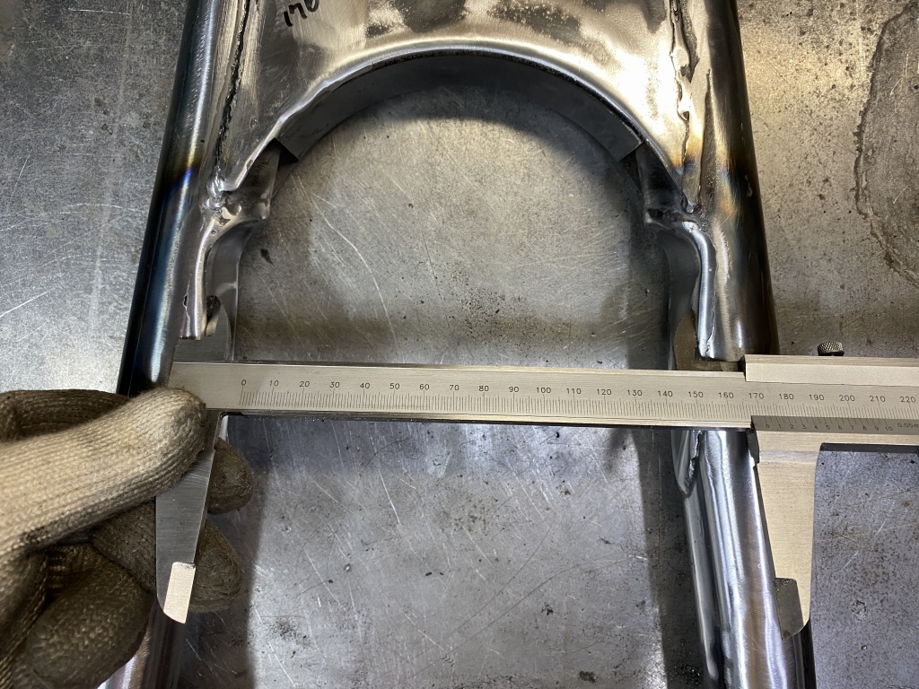アクスルシャフトのところに挟んであるパイプは、スイングアーム内幅を純正のままに保つためです。これが無いと溶接で歪み狭くなってしまいます。