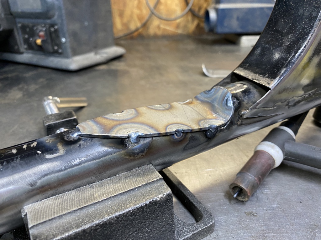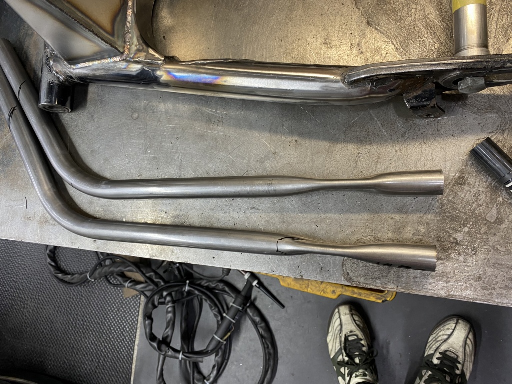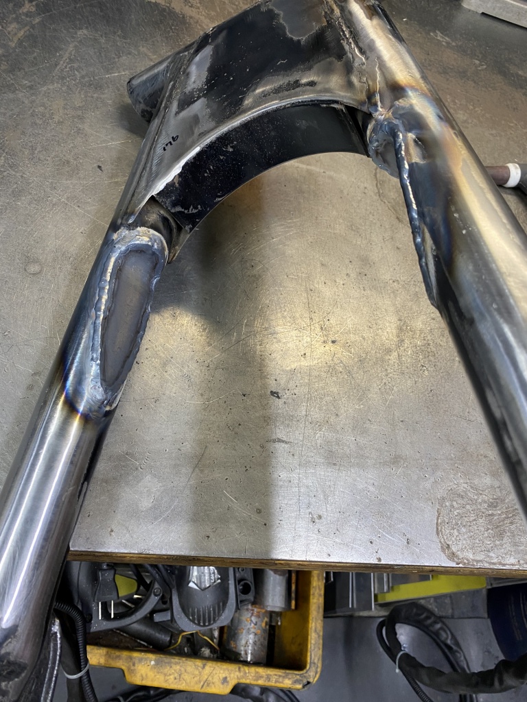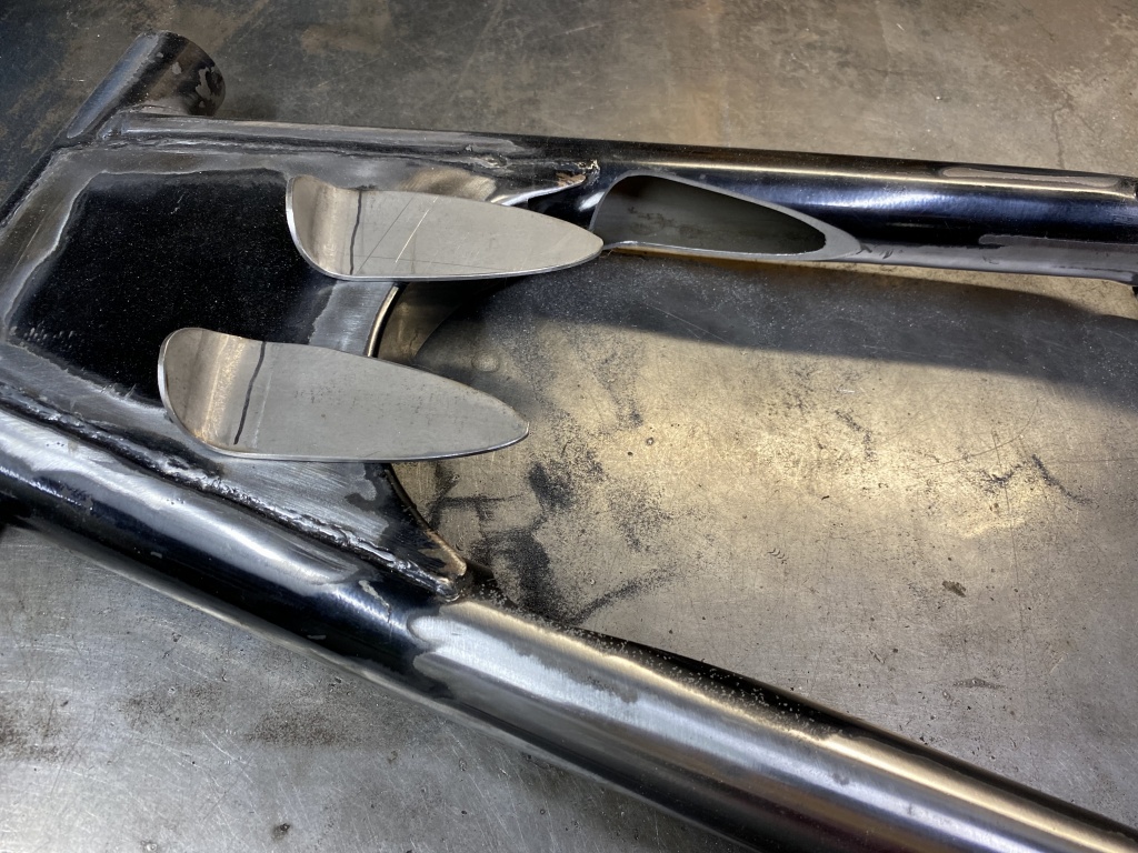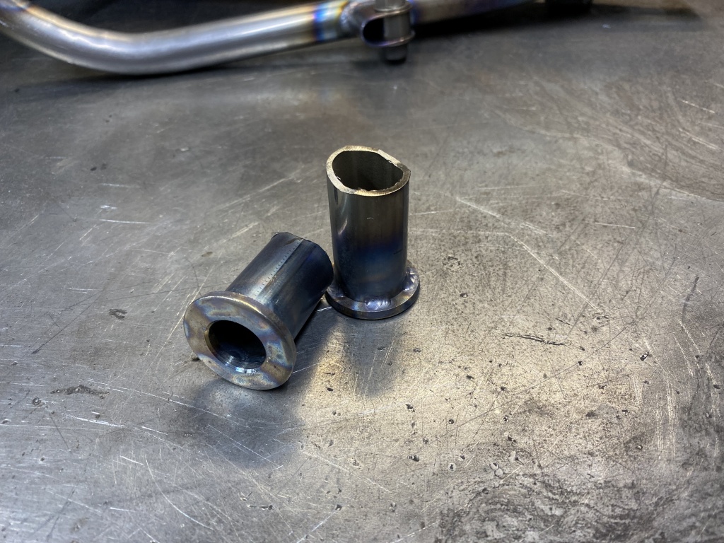アクスルシャフトのところに挟んであるパイプは、スイングアーム内幅を純正のままに保つためです。これが無いと溶接で歪み狭くなってしまいます。
