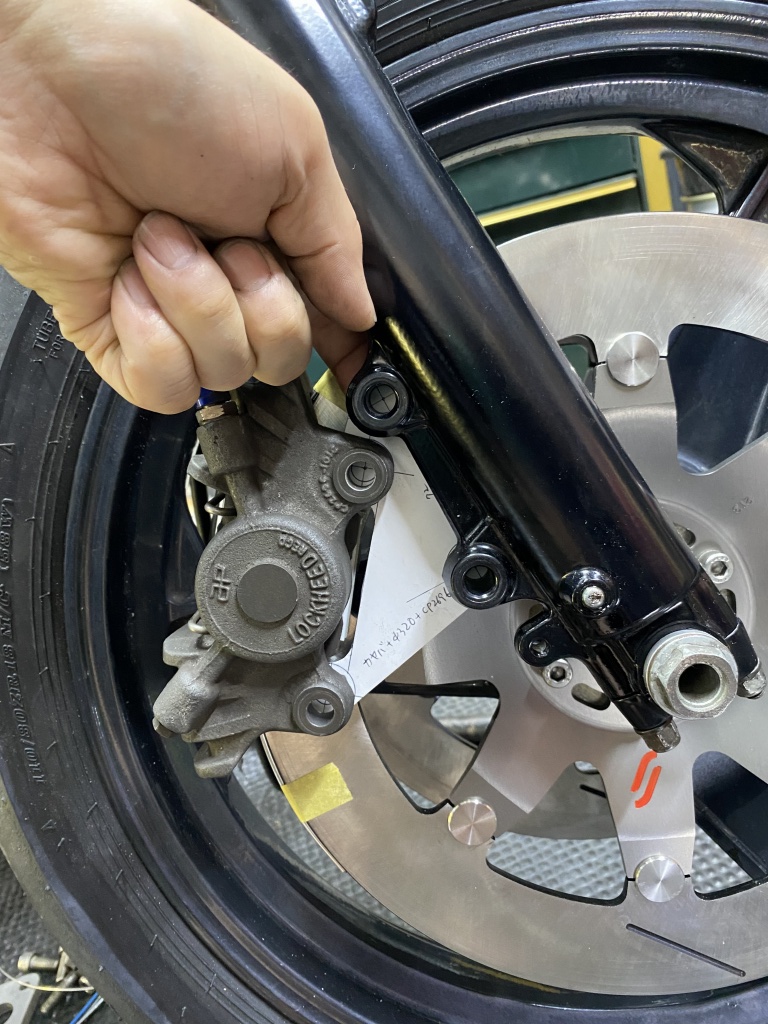 ここで不具合を発見。ホイールセンターが車体右側にかなり寄っています。オーナーさんに確認したところ、元のフォークが加工されていたため、この未加工のカヤバとズレてしまったのではないかとのこと。カラーを修正してセンターを合わせることになりました。