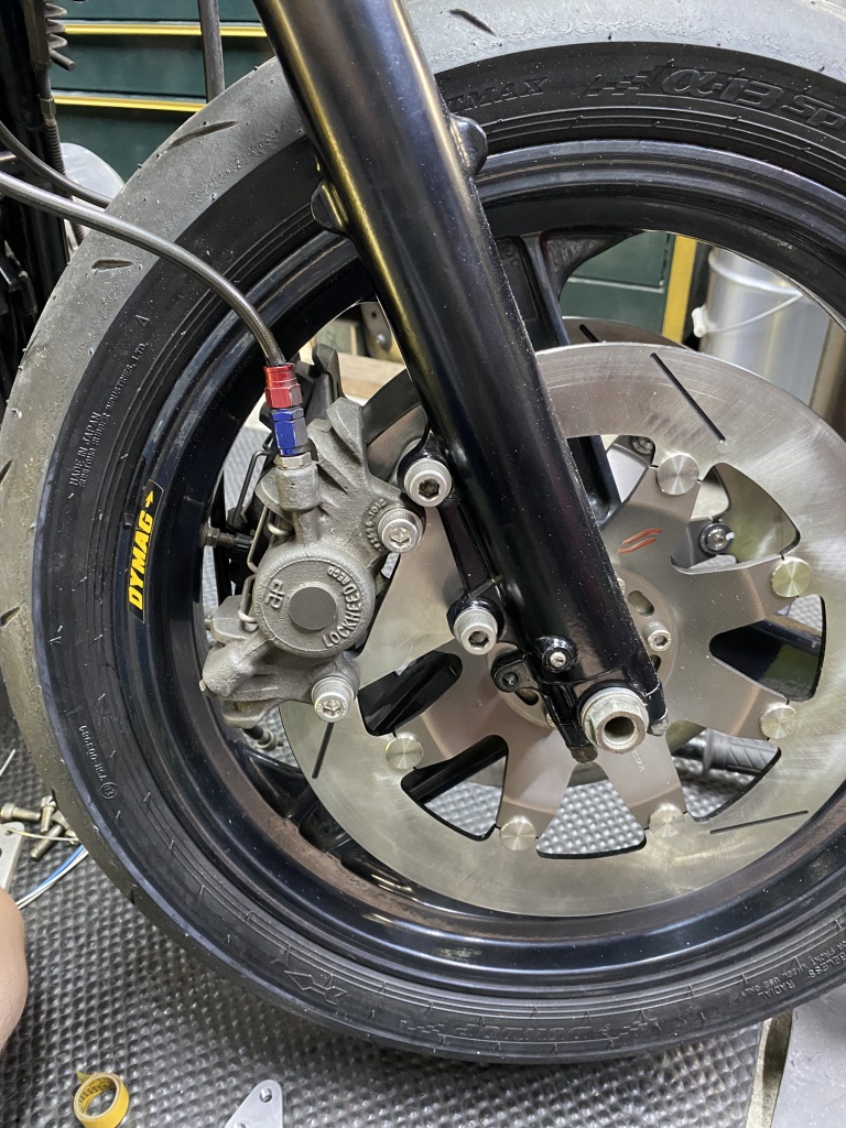 ローターも合わせてサンスターのネオクラシックに変更されています。径はφ320ミリ。先ずはキャリパーとローターのクリアランスを確保するためにローター外周にワイヤーをセットします。