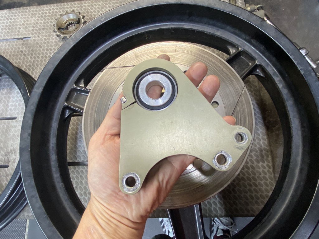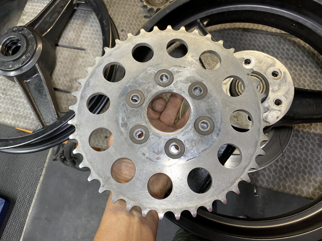 フロントはGPZ1100の純正スプロケに、内側に5ミリのスペーサーを入れてトータル10ミリオフセットとして装着していたようです。