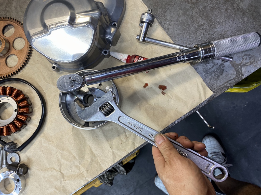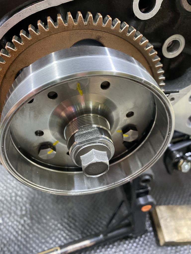 クランクにジェネレーターローターを取り付けます。ボルトにはネジロックを塗布します。