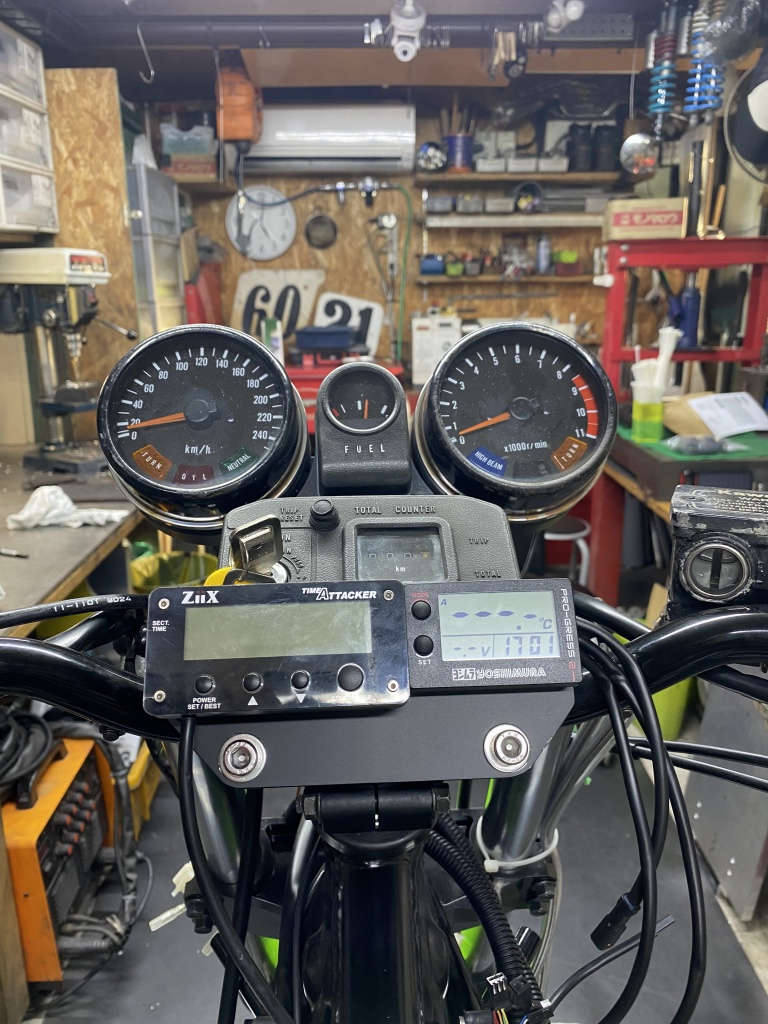 マルチメーターとラップタイマーをマウント。サーキットのストレートでは伏せた状態でタコメーターとスピードメーターの間から前方を覗くので、サーキット優先のレイアウトです。