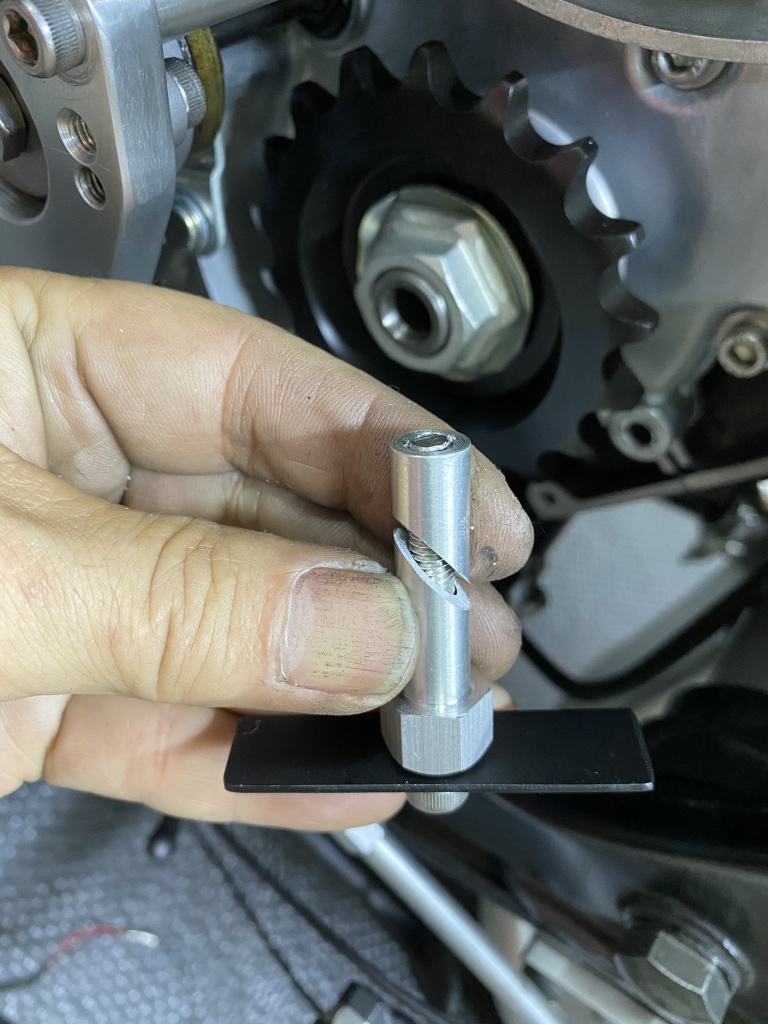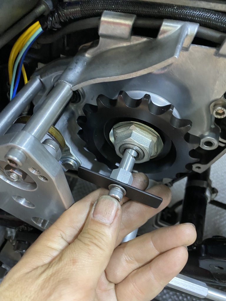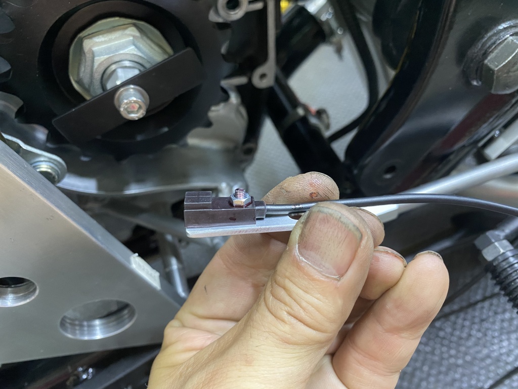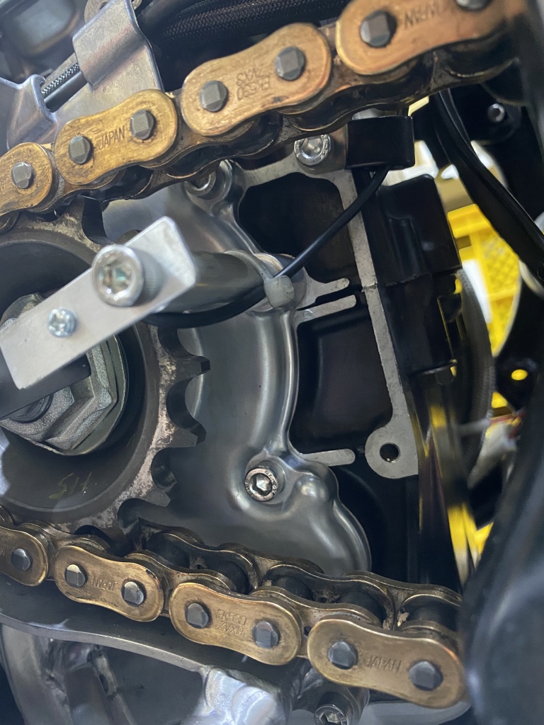 センサーを取り付けたところ。センサーと回転子のギャップは2~3ミリでOK。ステーを曲げるか支柱のアルミカラーの長さを調整して合わせます。画像のスプロケットは530のオフセット10ミリ(スプロケ本体のオフセットは15ミリ)です。530×18Tまで対応します。