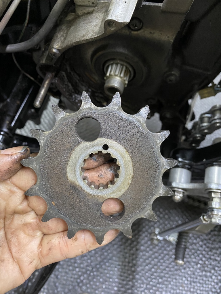 フロントスプロケットは摩耗が多いので要交換です。チェーン、スプロケとも、530へのコンバートをお勧めします。