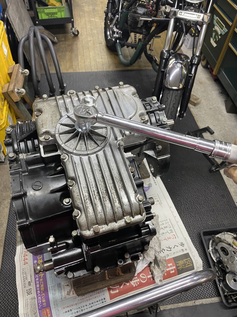 オイルパンを取り付けます。旧車なのでドレンボルトなども是非トルク管理してください。