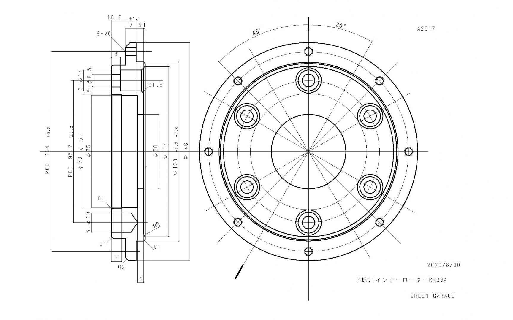 フロントホイールハブとインナーローター周りの断面図がこちら。弊社のS1ローターを実装するため、ドッキング部の形状を検討し、ここから子部品の図面とホイールの追加工図を起こします。