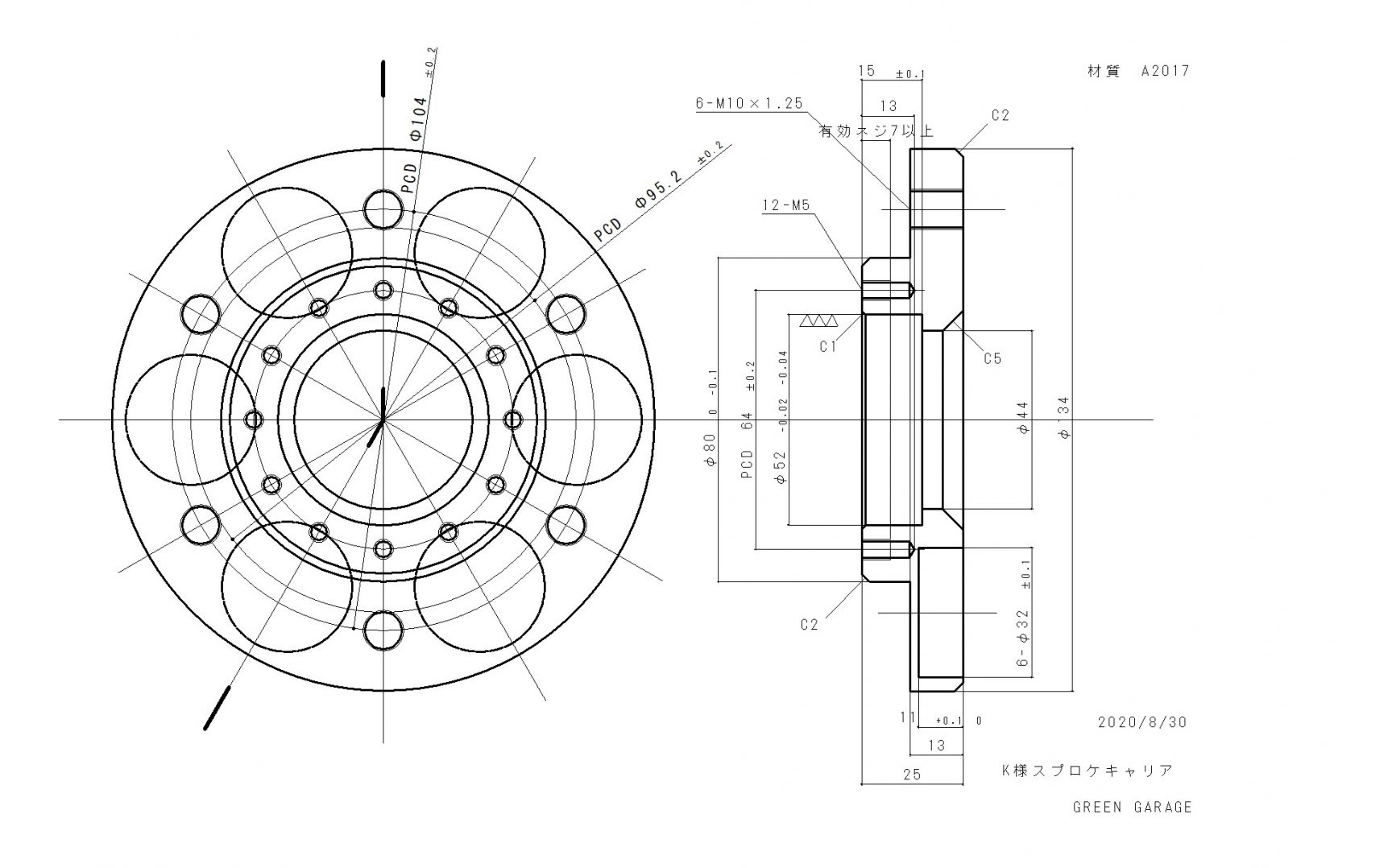 ハブダンパー内臓式のスプロケキャリアはこちら。現行のダイマグホイールのキャリアと同様の構成です。S1のスプロケキャリア風に、こちらはダミーのボルトも12個配置しました。スプロケの規格はZ1000R純正ホイールやモーリスと同じピッチを採用。チェーンラインは10ミリオフセットされます。