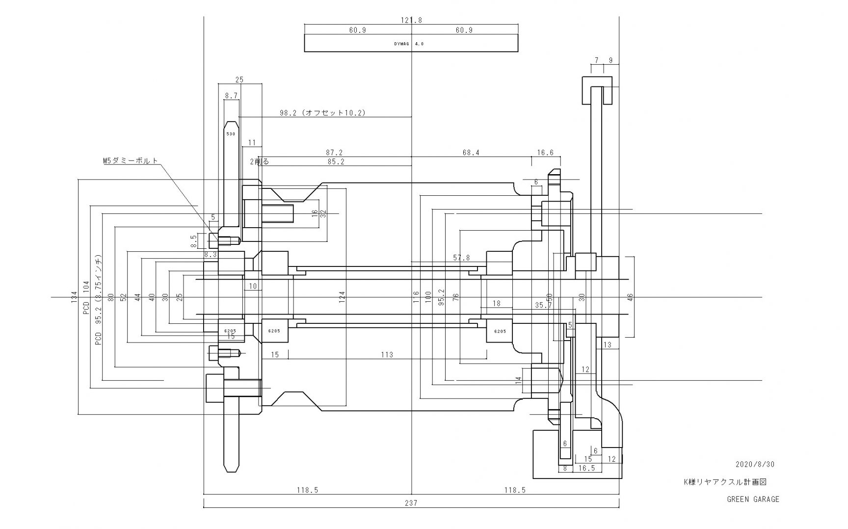 続いてリヤアクスル周りの計画図です。スイングアームの内幅に対し、ホイールのセンターを合わせ、スプロケキャリヤ、リヤローターなどをレイアウトします。