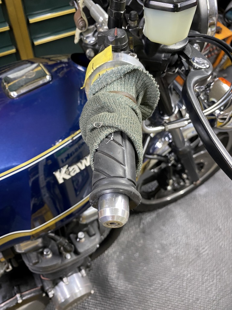 スロットルを開閉すると少しフリクションが大きい感じ。グリップをめくってみるとスリーブよりグリップの方が1センチほど長い状態です。はみ出したグリップのゴムが抵抗となり、スロットル操作のフリクションとなっていました。これはよくあることです。