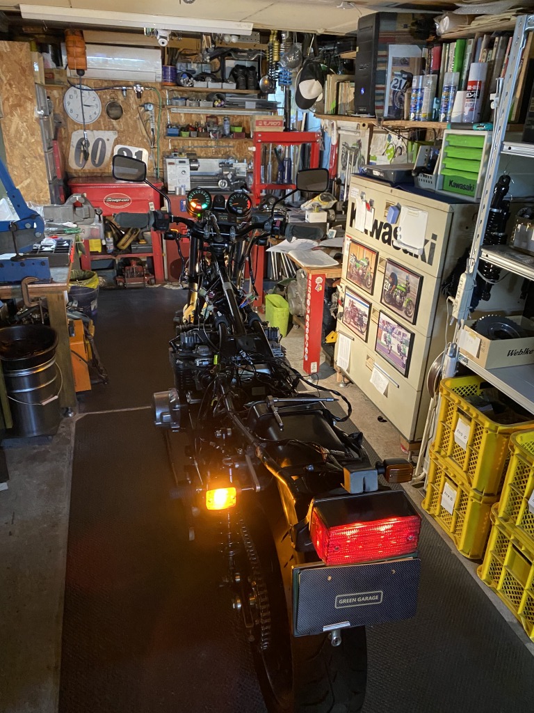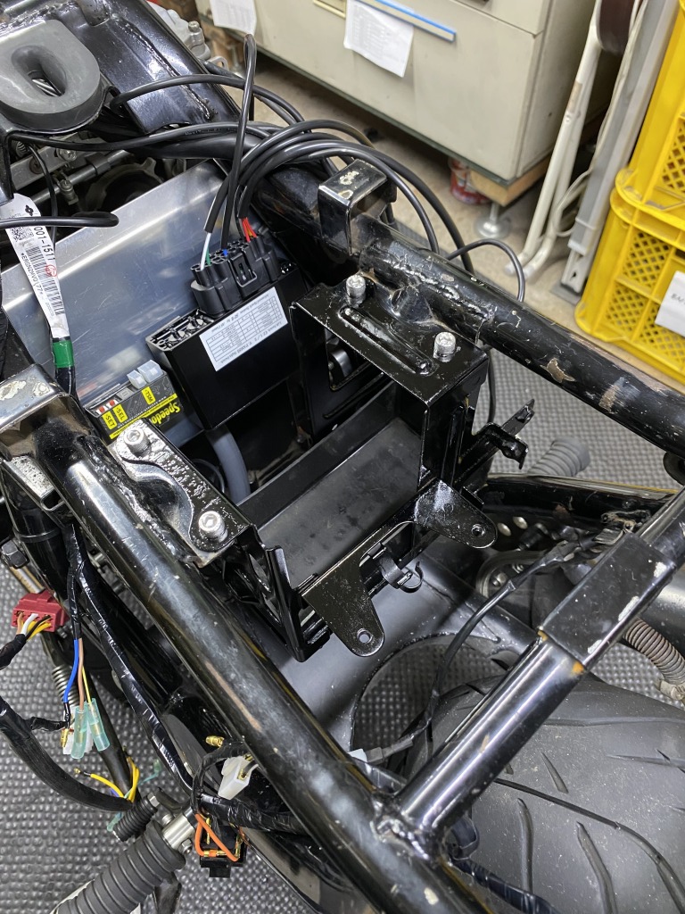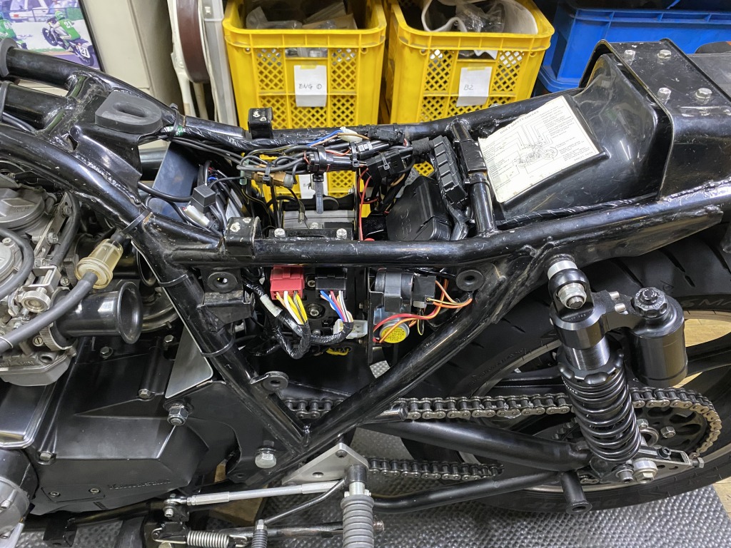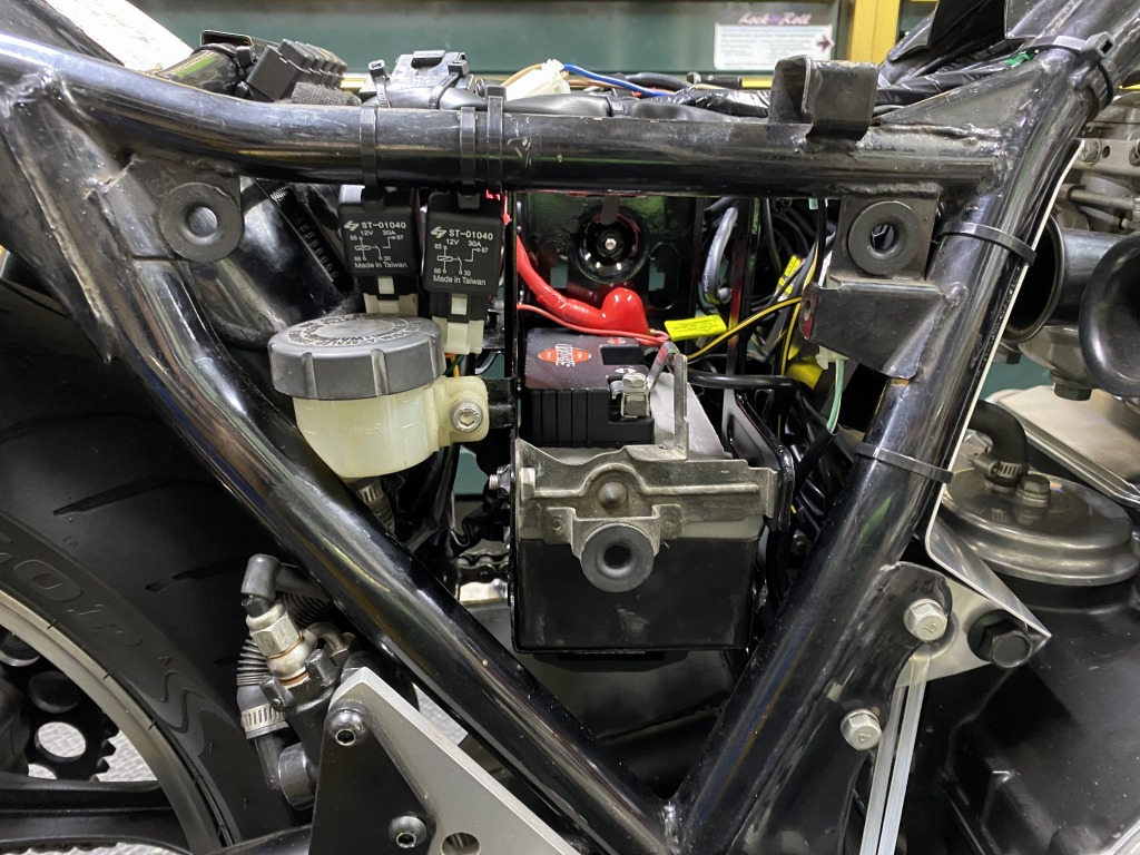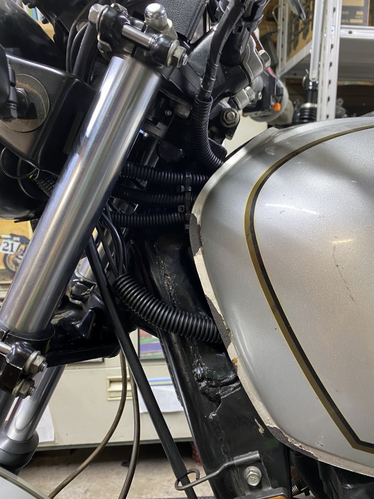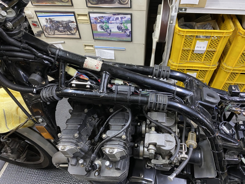 スリム化したメインハーネスは、こんな感じでタンクとフレームの隙間を通します。下に垂れ下がらないので見た目もスッキリ。