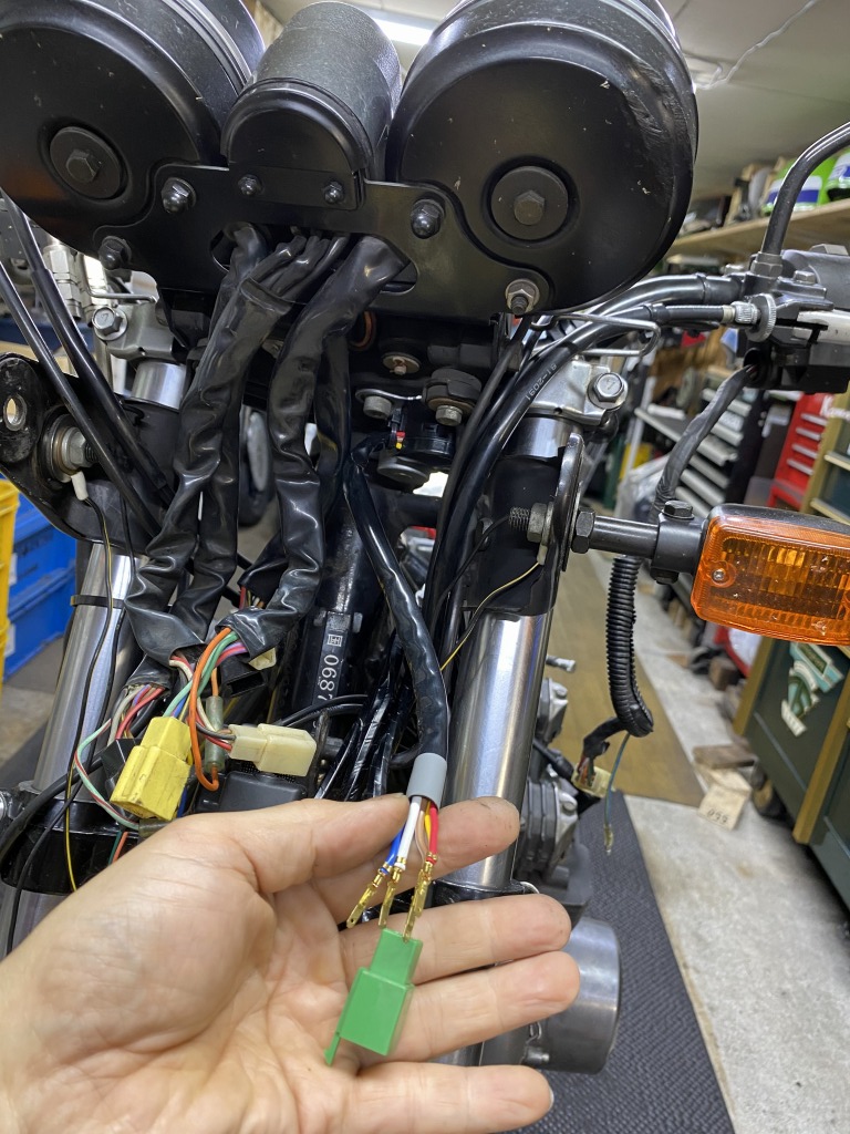 エリミネーター250のイグニッションスイッチは、5本の配線の端子とカプラーを交換してZ1000R2のメインハーネスに合わせます。