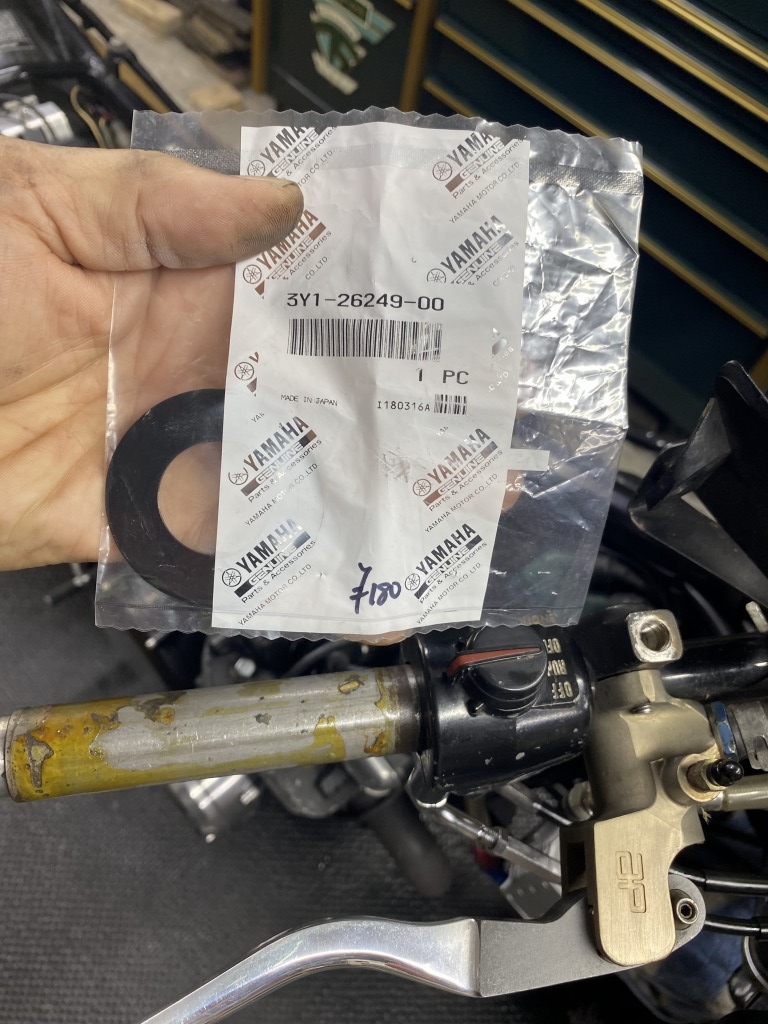 ヤマハ純正部品でここに入れる樹脂ワッシャーがあるので使用します。部品番号は 3Y1-26249-00 価格は180円ほどです。