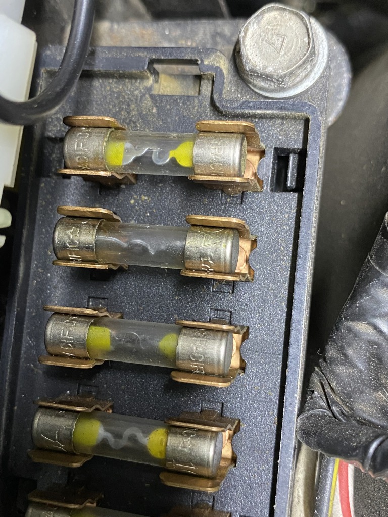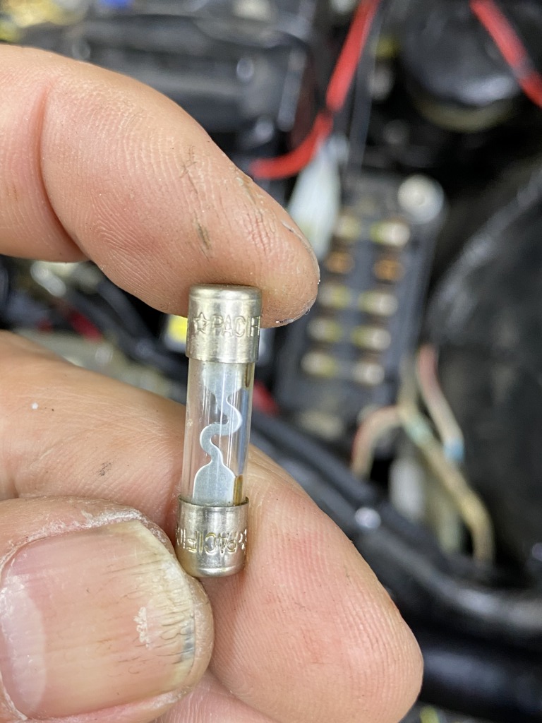 端子の汚れを拭き取ってからヒューズを付け直すと、今度は電源が正常に入ります。全ての電装系も正常に動作します。単なるヒューズ端子の接触不良だったようです。