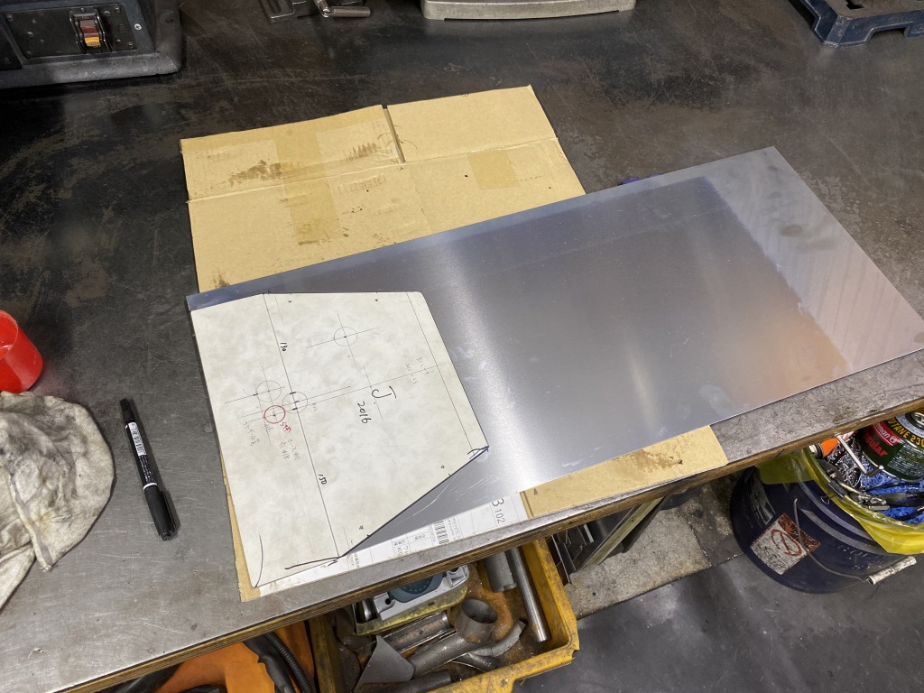続いてキャブ後方隔壁を作ります。ジュラルミン板から型紙通りに切り出します。