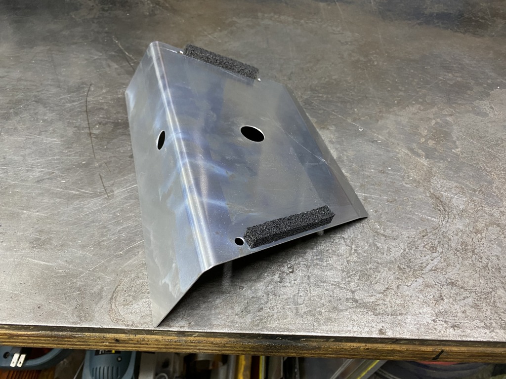 隔壁取り付け後はこんな感じ。キャブの吹き返しを遮断し、リヤタイヤからの砂粒の飛散も防ぎます。ホースは90°に曲がった専用品を使います。