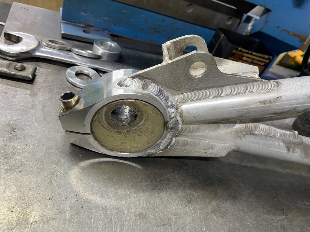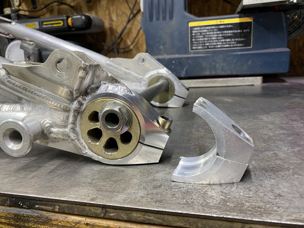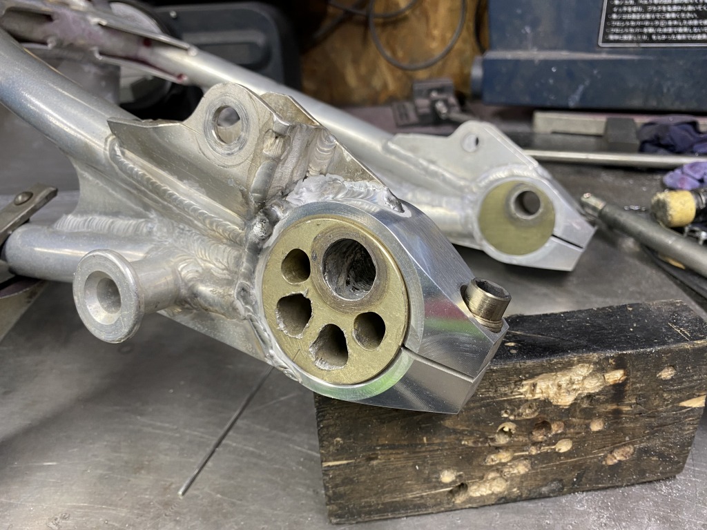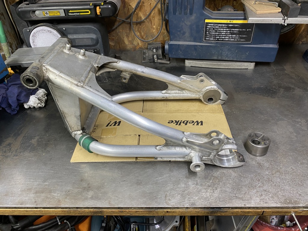 エキセントリックハウジングが割れてしまったS1スイングアームを修理します。
