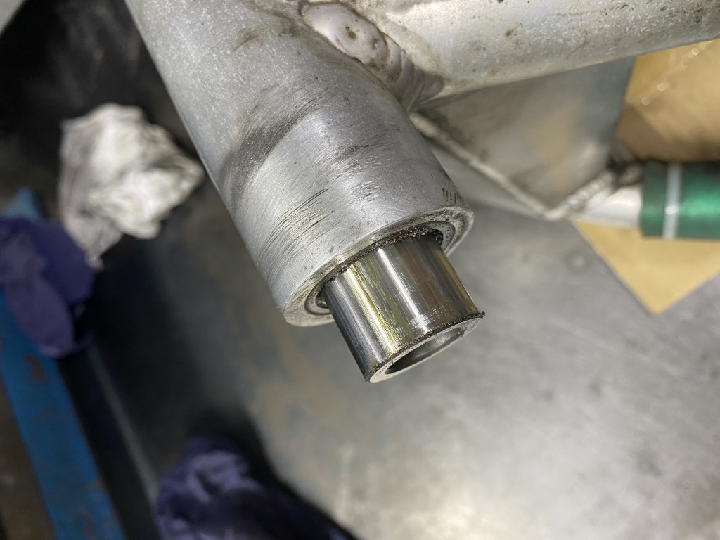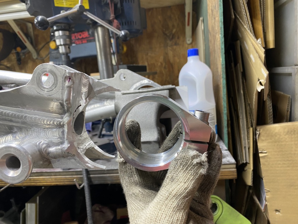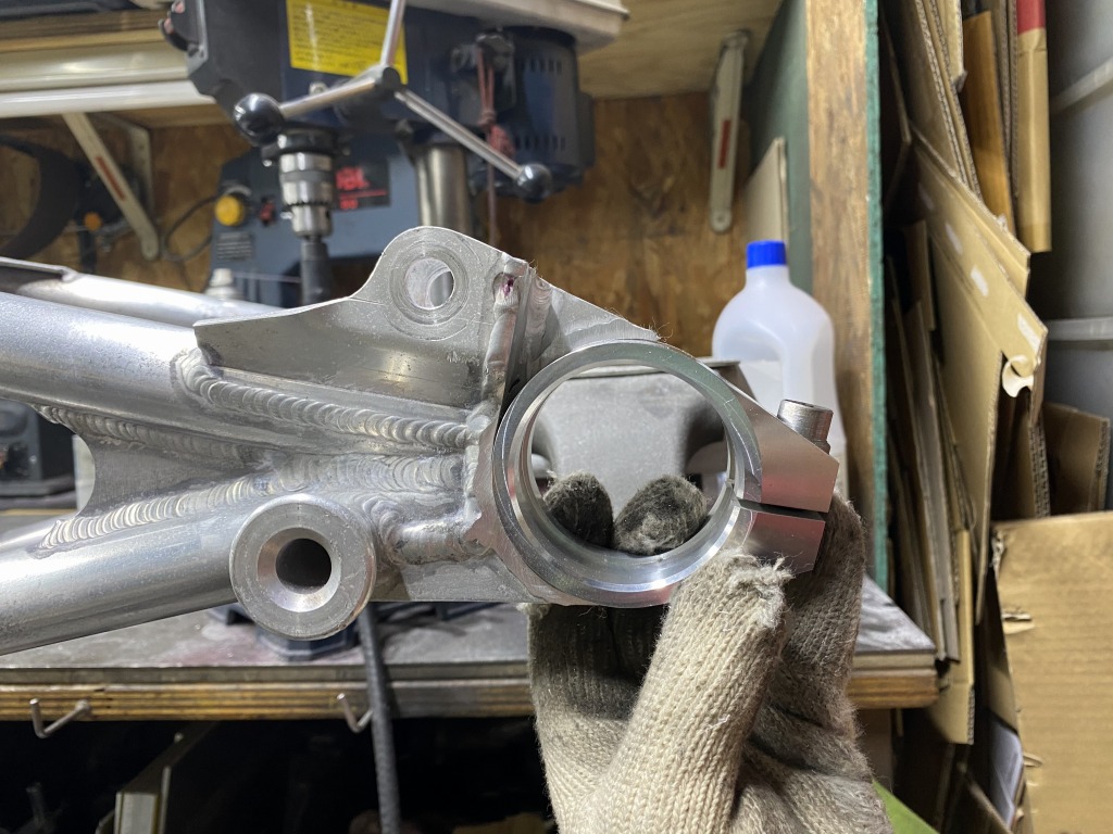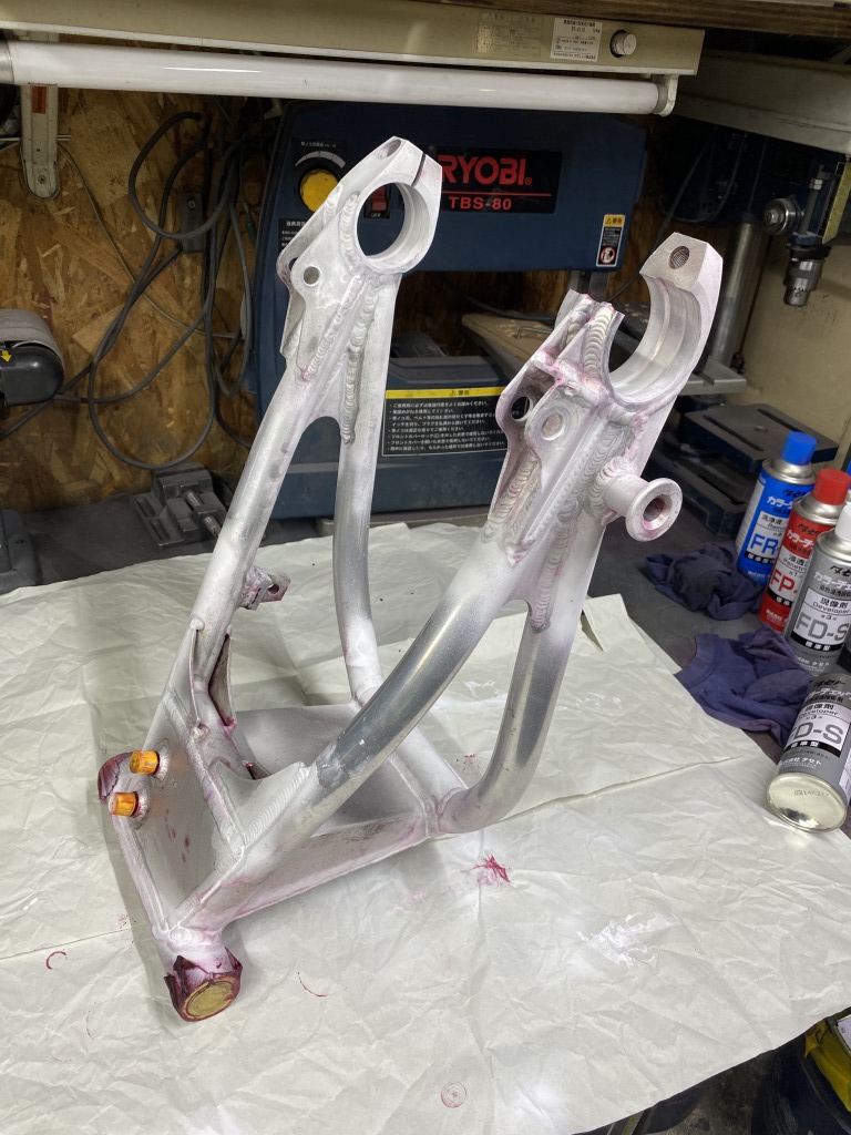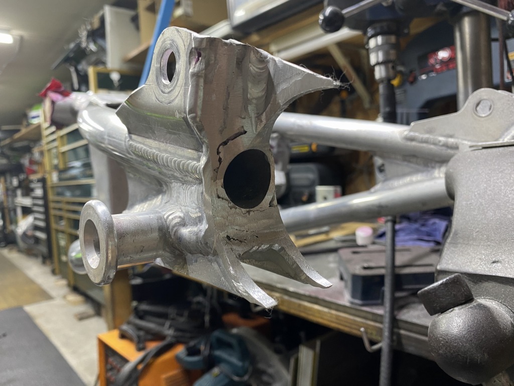 エキセントリックハウジングが割れてしまったS1スイングアームを修理します。