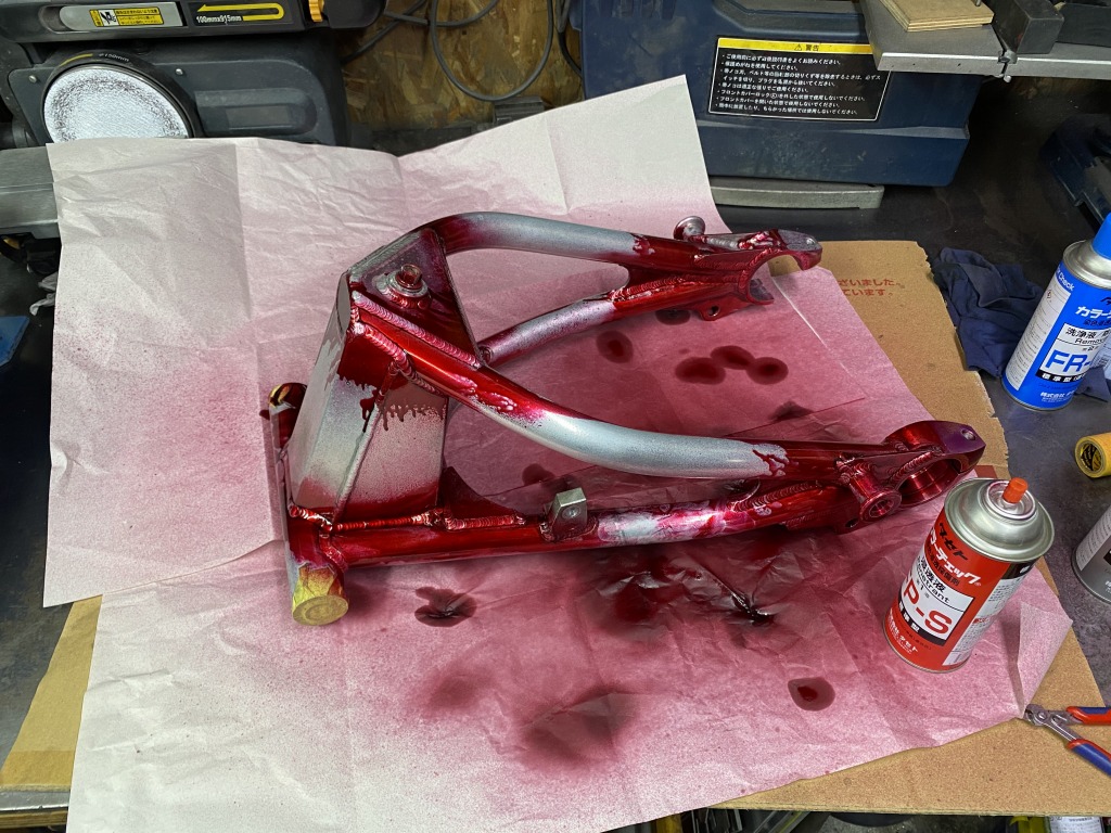 スイングアームを外します。弊社にメンテナンスに来ていただくようになって5年ほど経ちますが、このスイングアームを外すのは今回が初めてです。