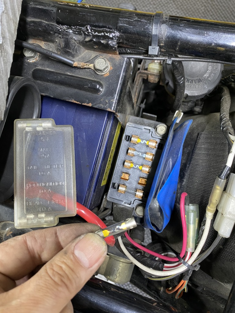 ヒューズを見ると、ヘッドライトのは切れておらず、ホーンイグニッションのヒューズが切れています。これを交換するとヘッドライトやその他の灯火類も全て復活しました。
