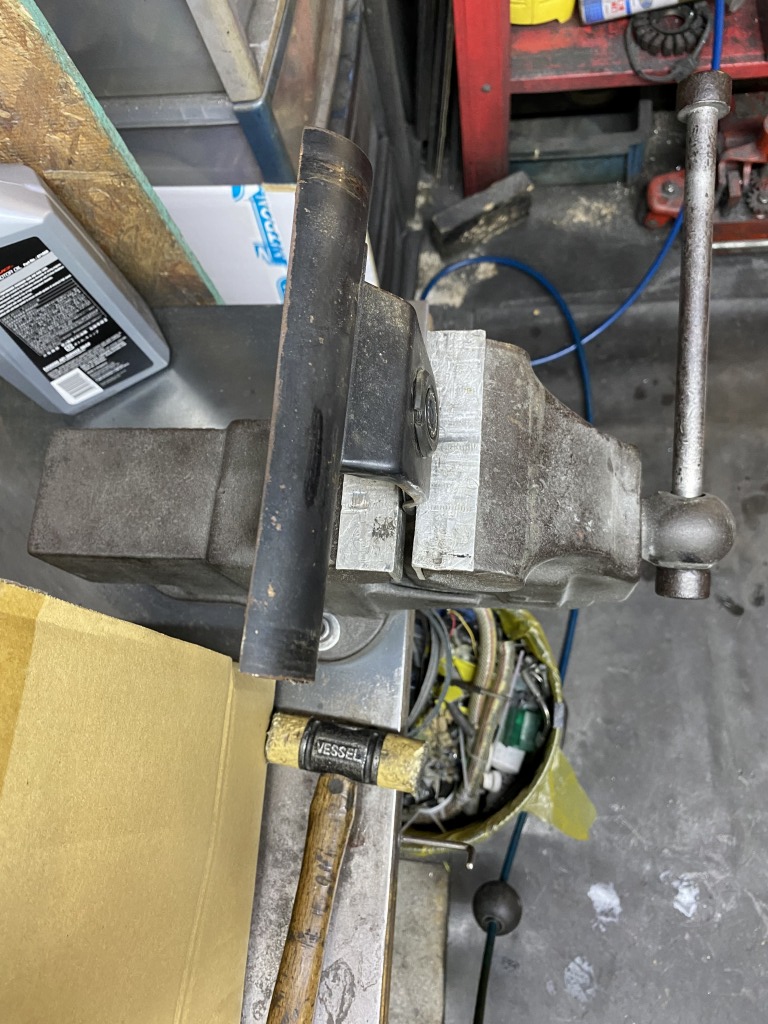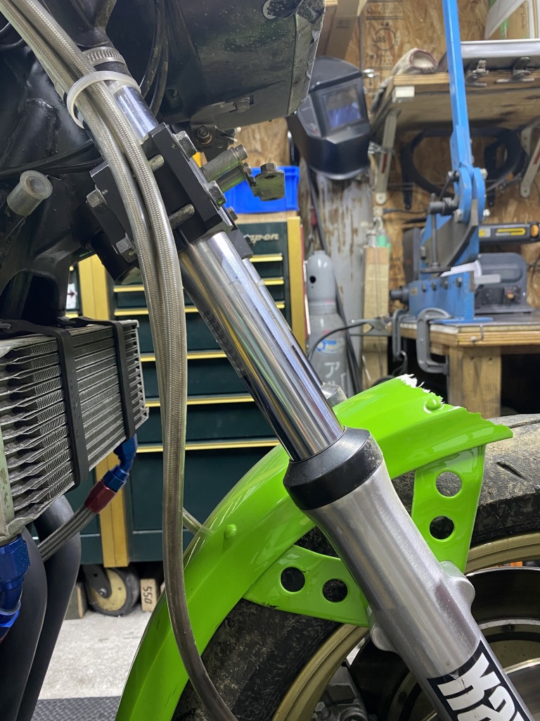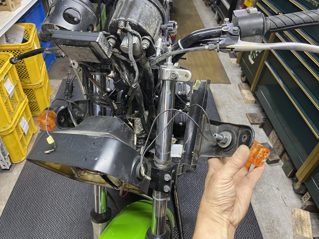 左右のヘッドライトステーは変形したので外して修正します。ステーは半割れにしてバンド止めなので簡単に外せます。