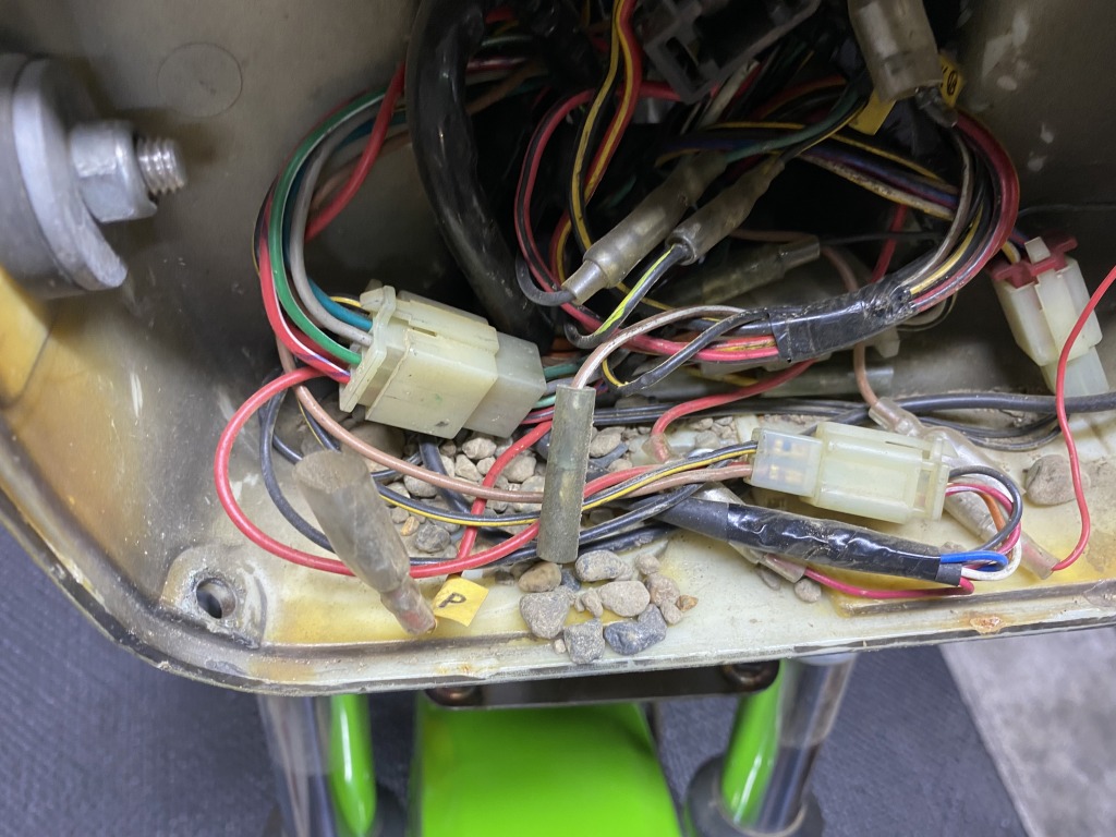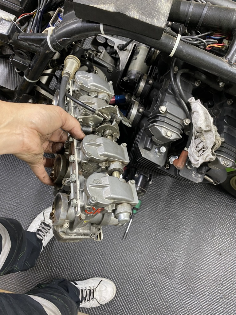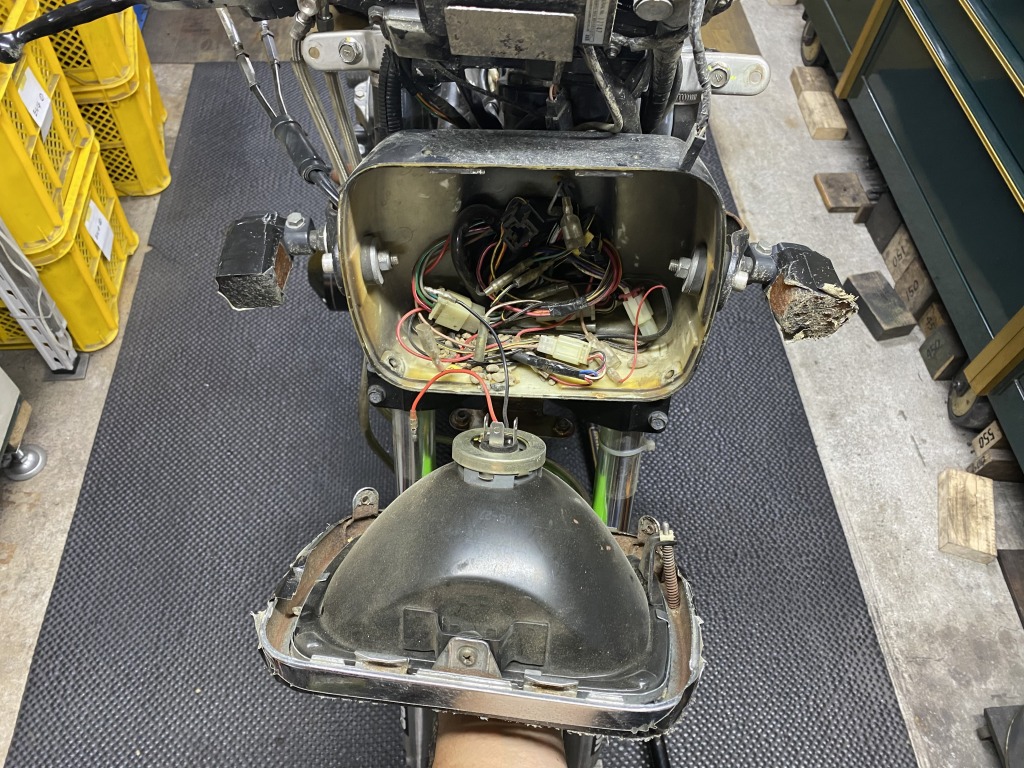 左右のステップやウインカーもほぼ無事です。外傷はヘッドライト周りにとどまっていますが、グラベルをキャブが吸い込んだ可能性があります。