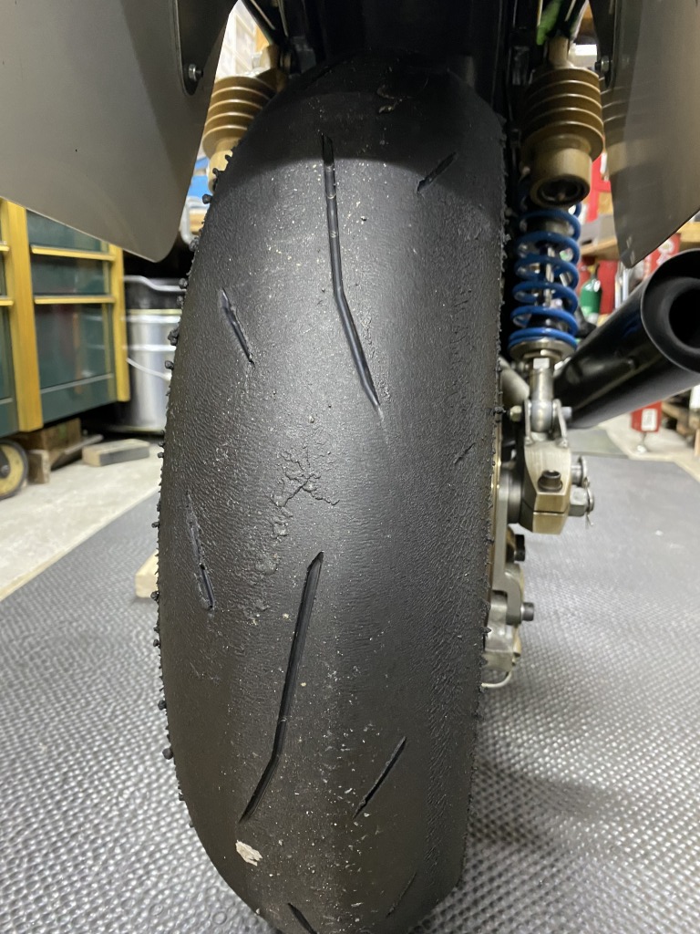 前回11月のTOTで新品投入した前後タイヤがここまでもちました。フロントの左右はスリップサインが出る直前。センターは5分山ほど。