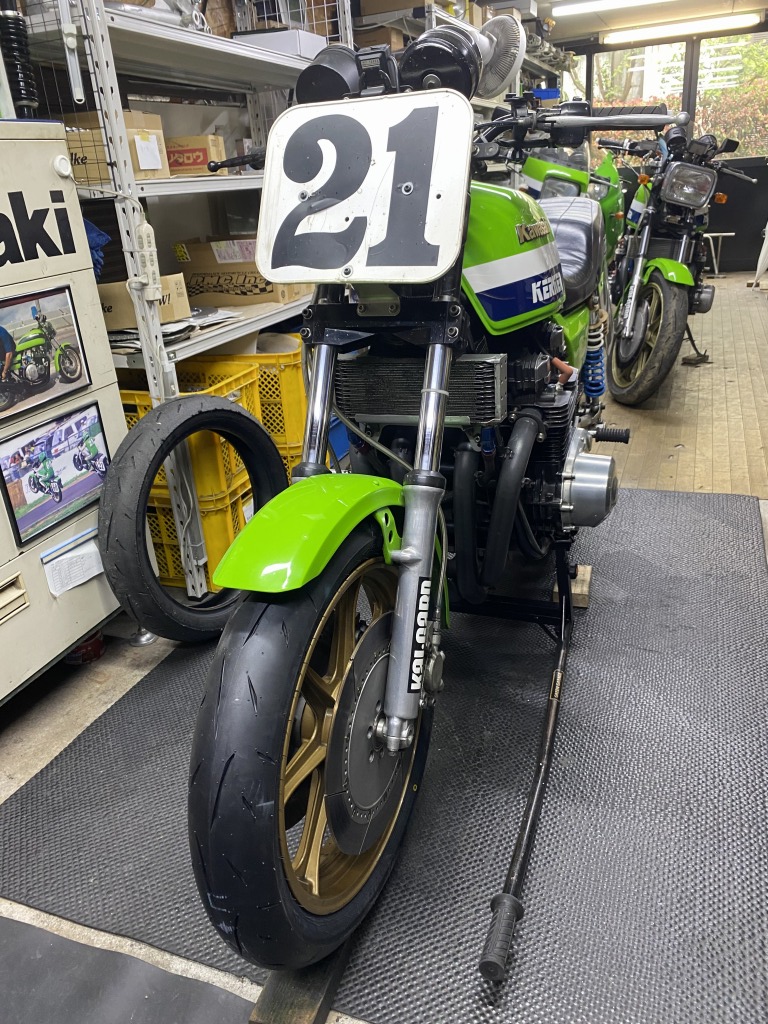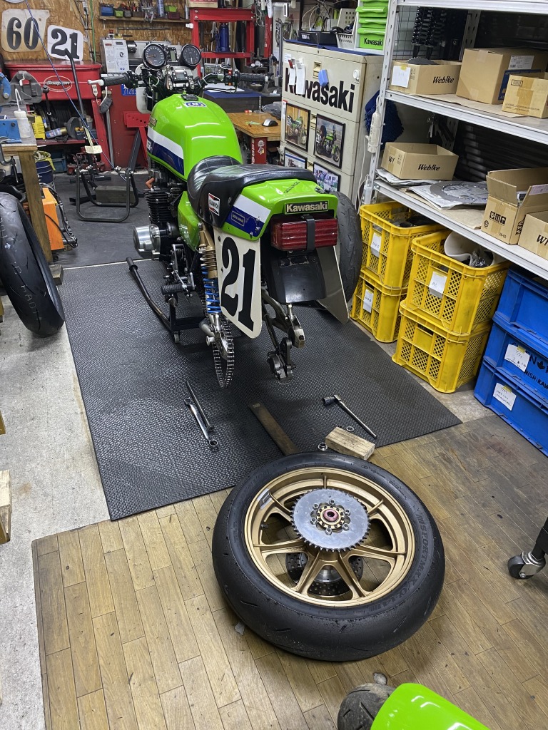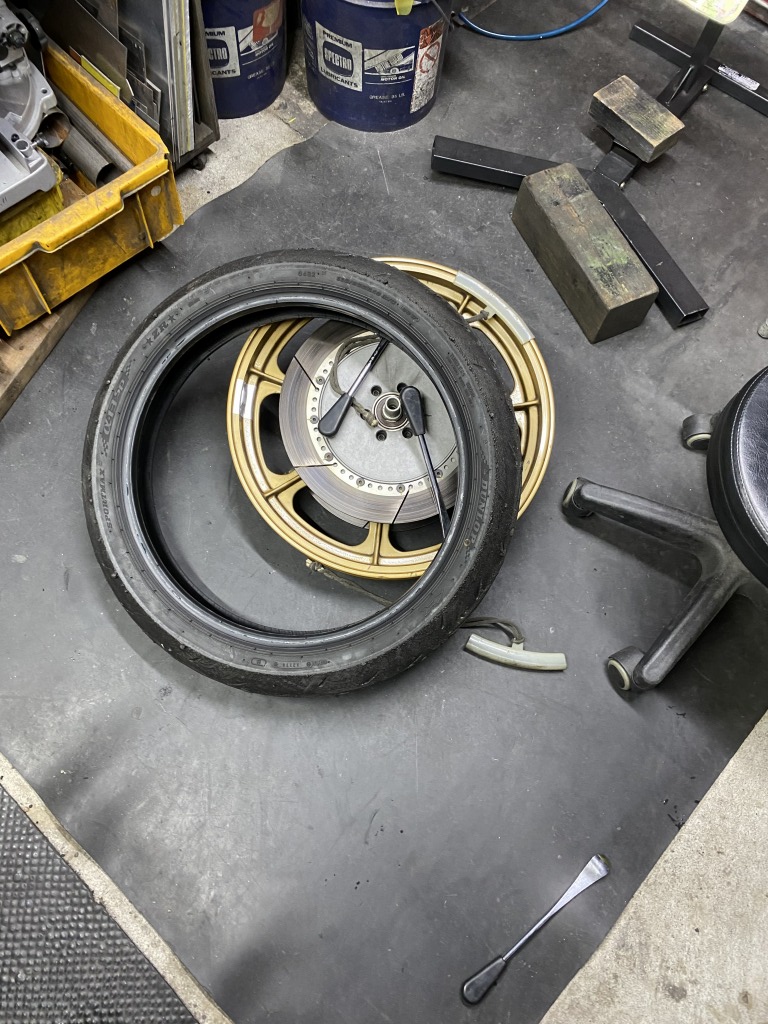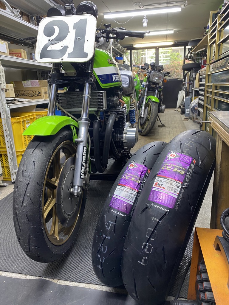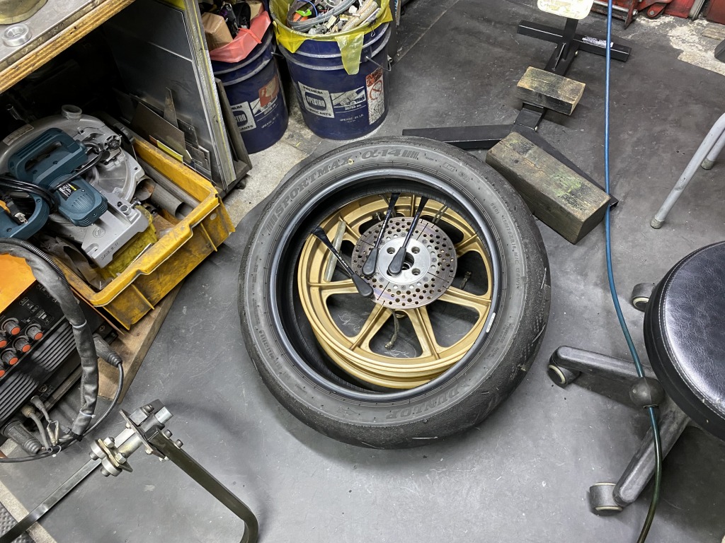 新しいタイヤは今と同じダンロップのアルファ14Zです。サイズは110/80-18と150/70-18。リヤはハイトの高い70タイヤがAMAルックには欠かせません。