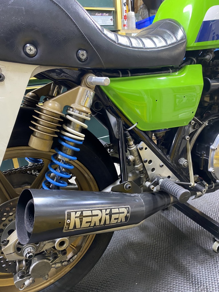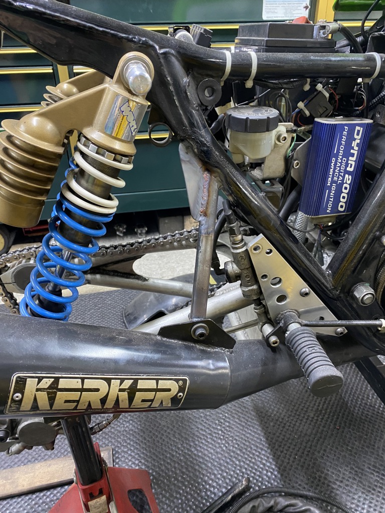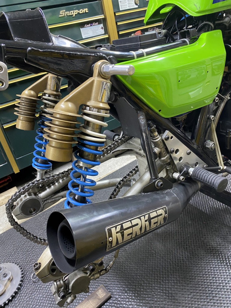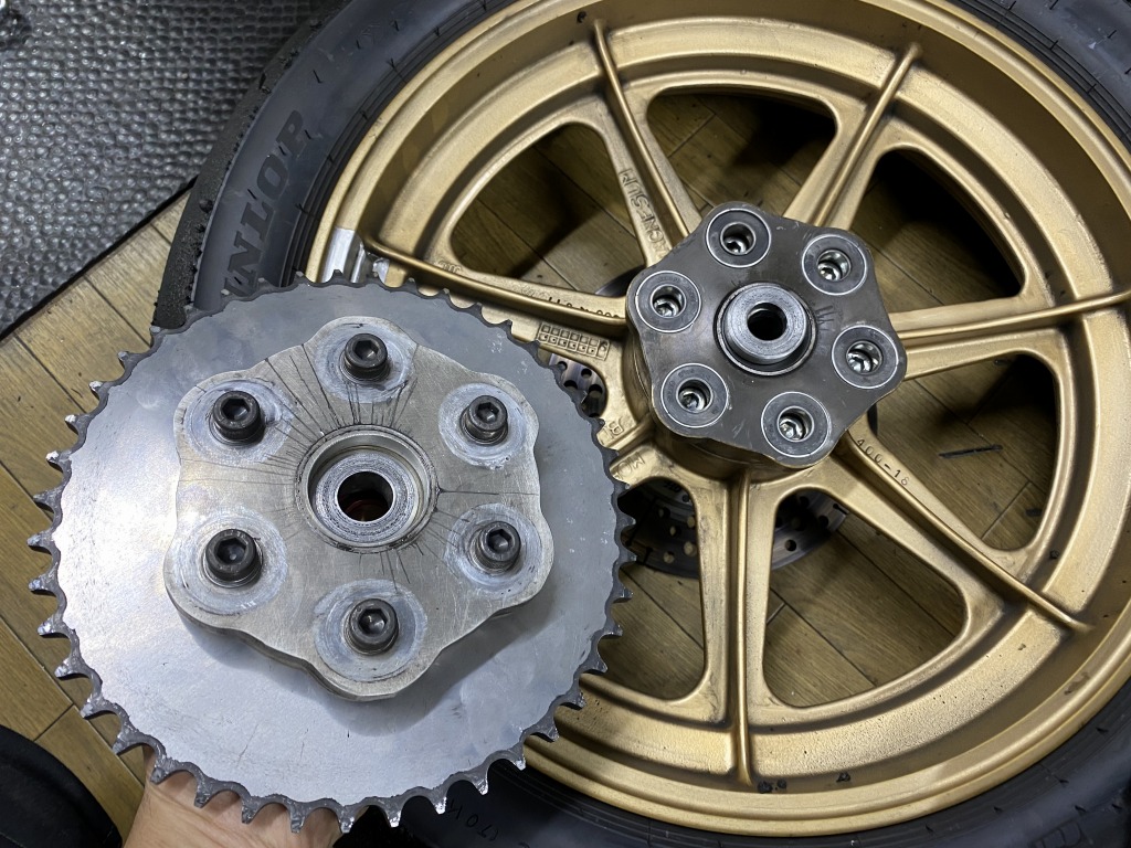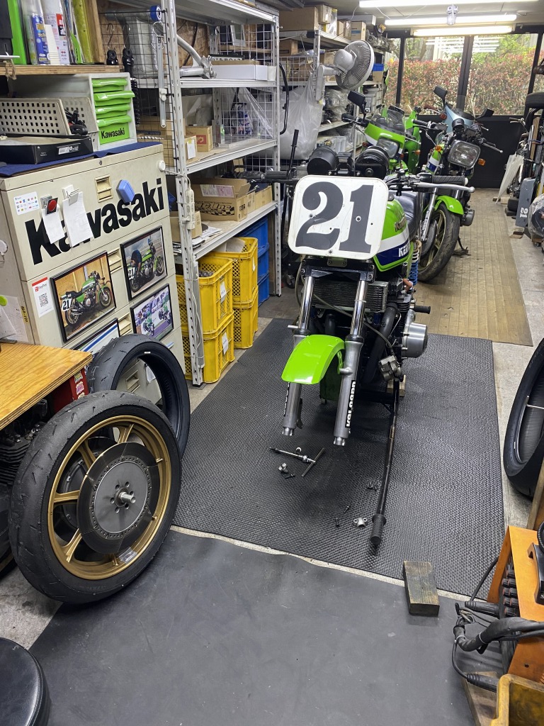 新しいタイヤは今と同じダンロップのアルファ14Zです。サイズは110/80-18と150/70-18。リヤはハイトの高い70タイヤがAMAルックには欠かせません。