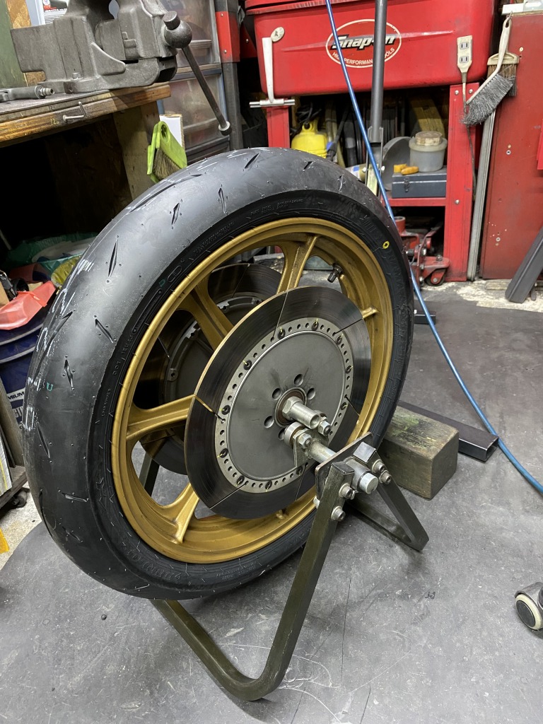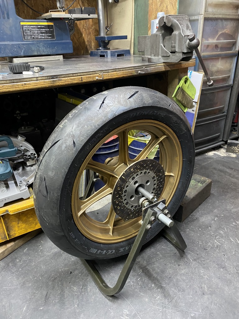タイヤを組換え、バランス取りします。今回はウエイト無しでOKでした。これはいいことあるかも。