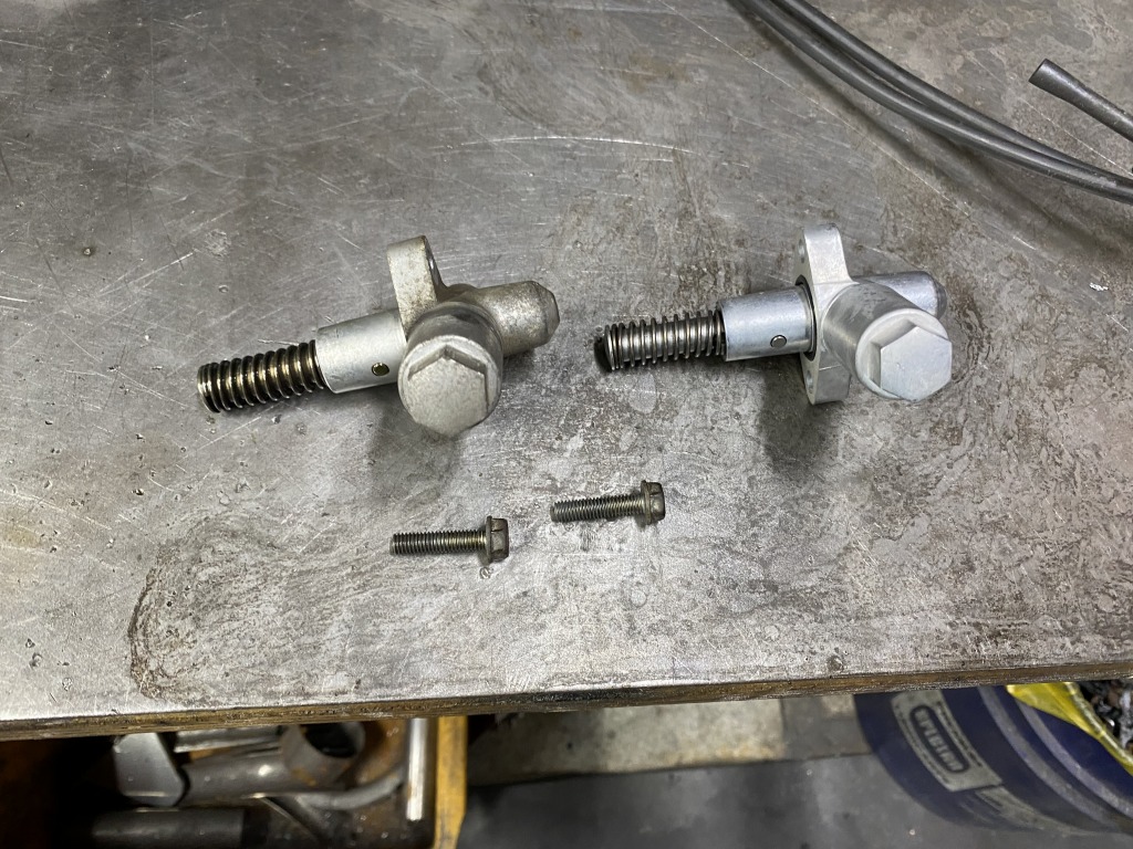 外したものは荷重をかけるとプランジャーが戻ってしまう状態で、もう交換時期でした。右側の純正新品に交換します。