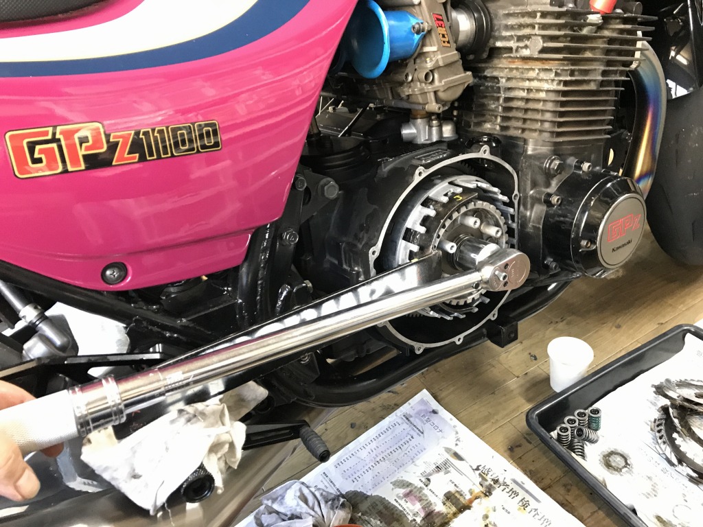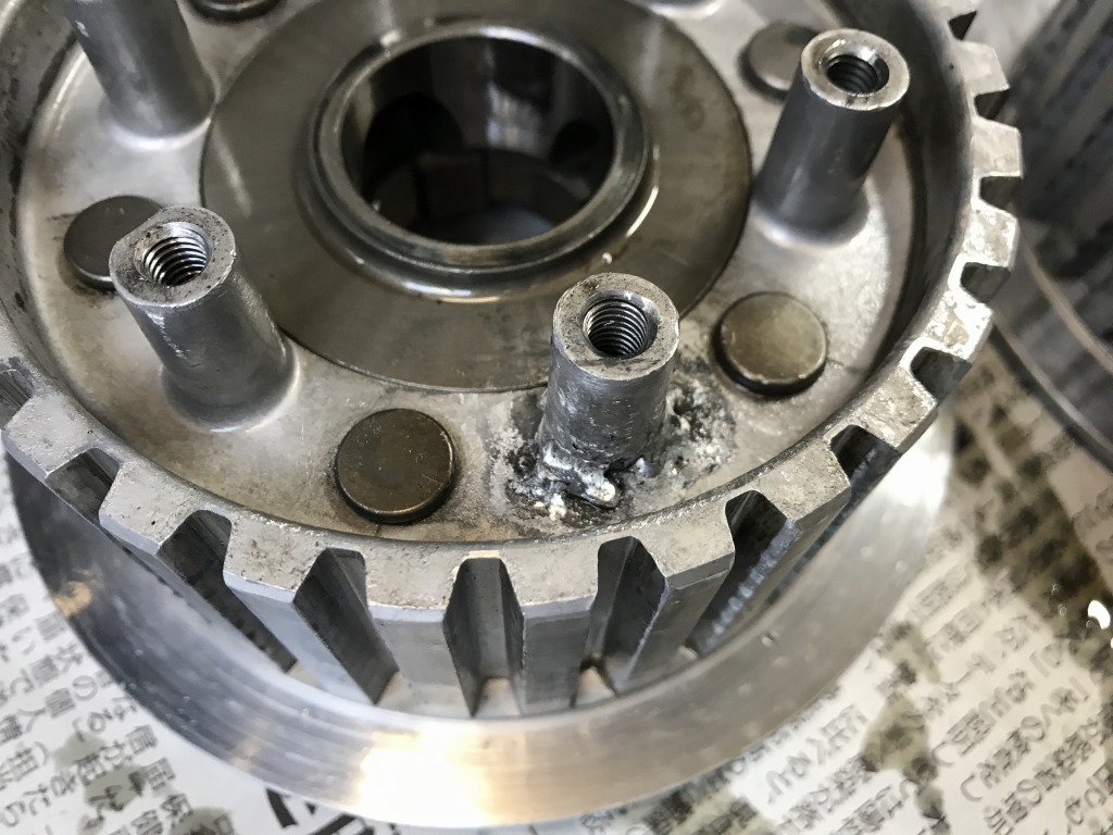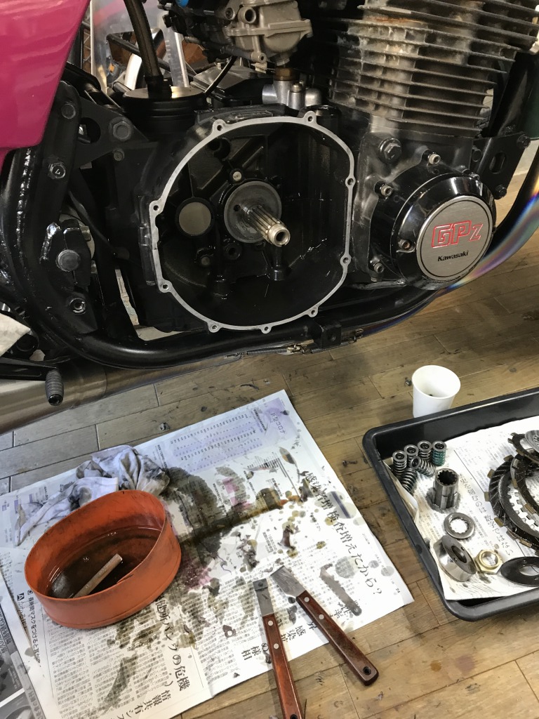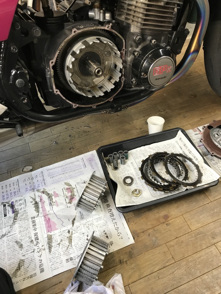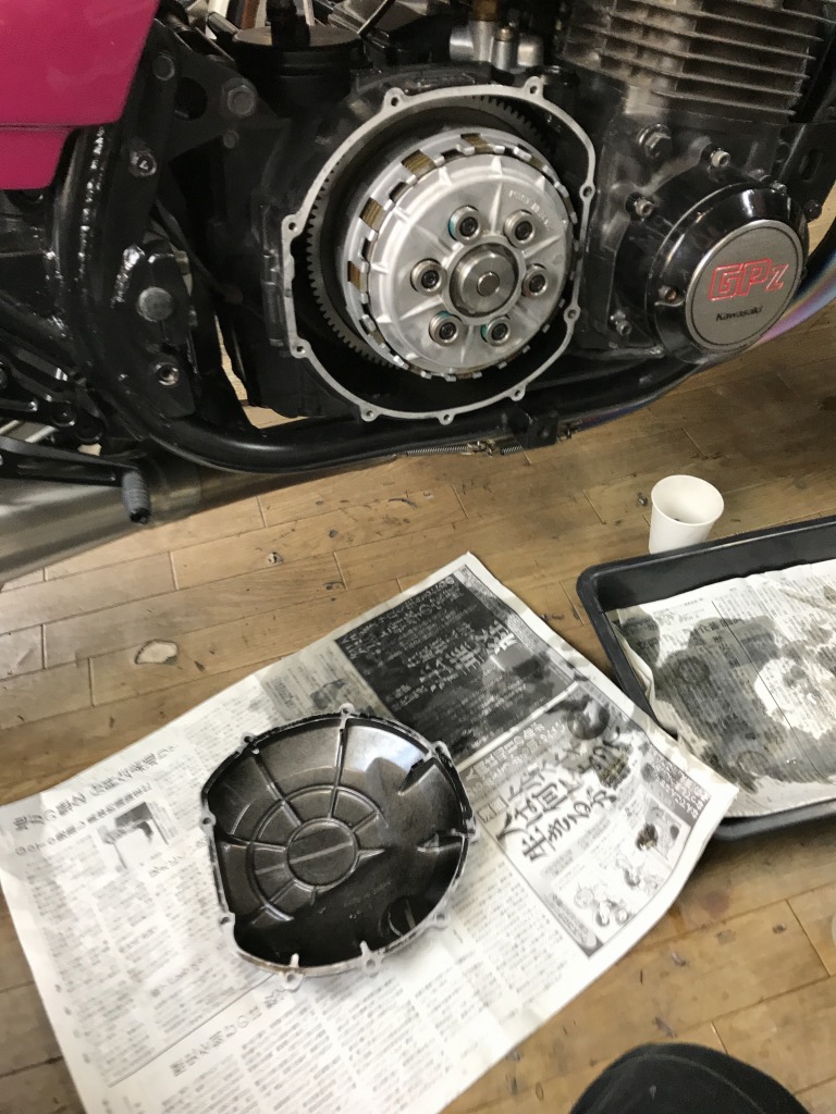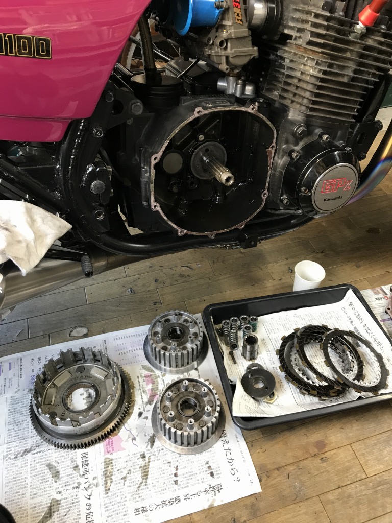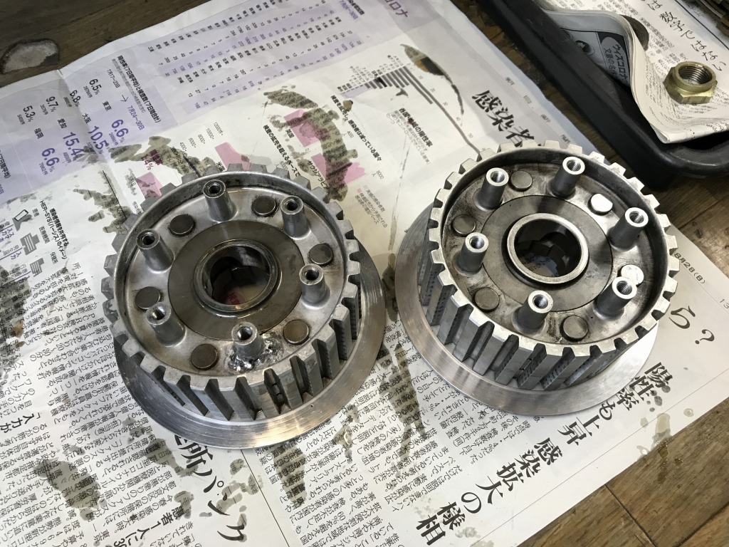 クラッチプレートとフリクションプレートは既に新品交換済みとのこと。クラッチを分解点検します。