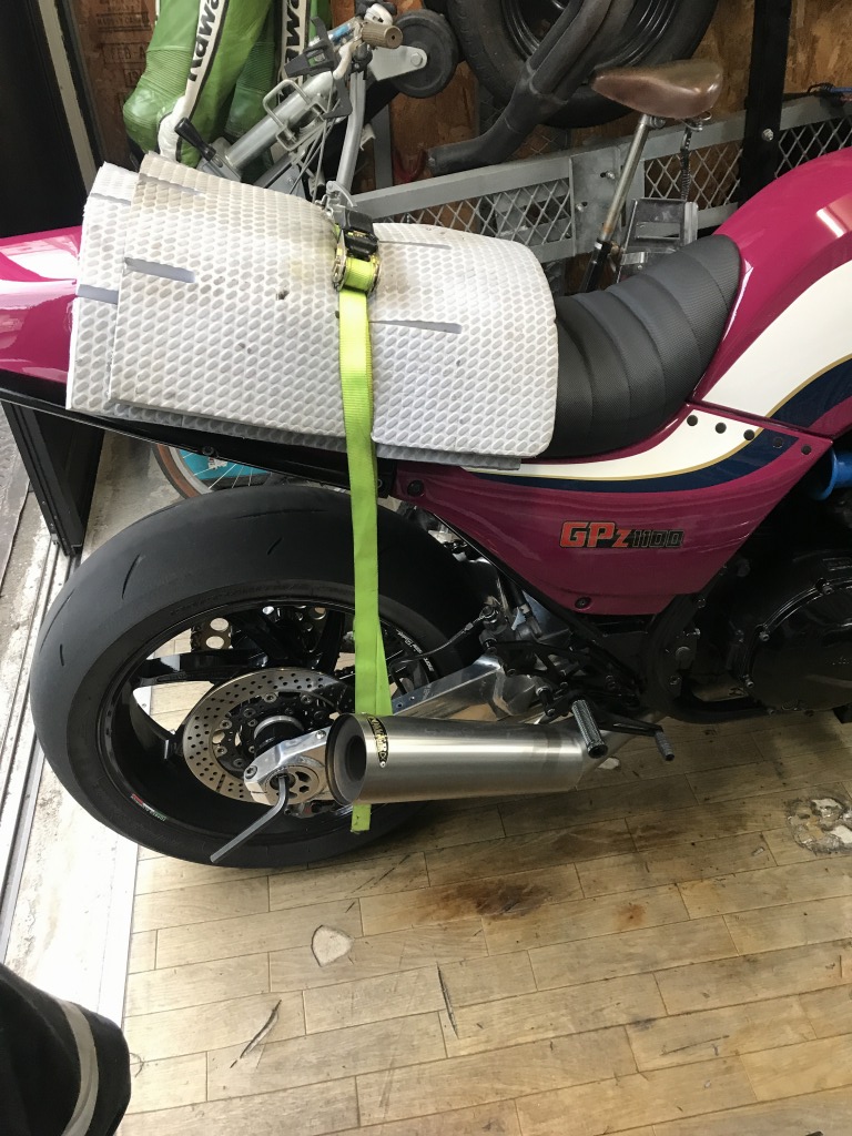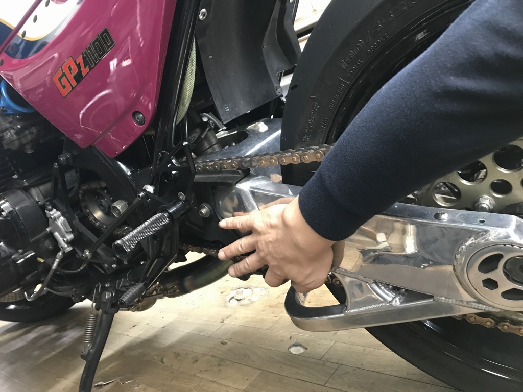 スイングアームの垂れ角が大きい上に張り過ぎなので、このままでは3軸のベアリングなどが破損してしまいます。リヤサスのプリロードが大きいので、タイダウンで締めてリヤサスを縮め、スイングアームの垂れ角をできるだけ減らしてからチェーンの張りを再調整します。