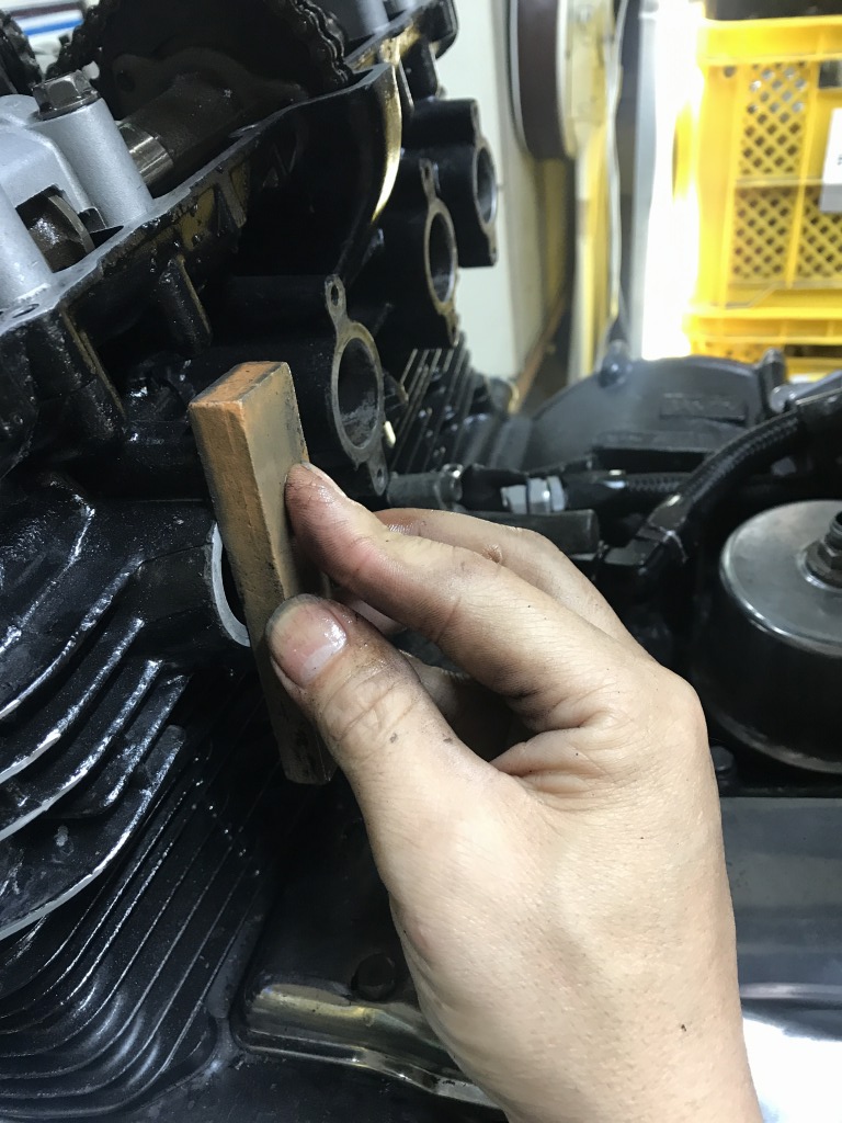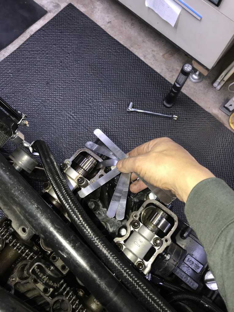 ヘッドカバーを開けて内部を点検。先ずはバルブクリアランスから。狭いところもあるので要調整です。