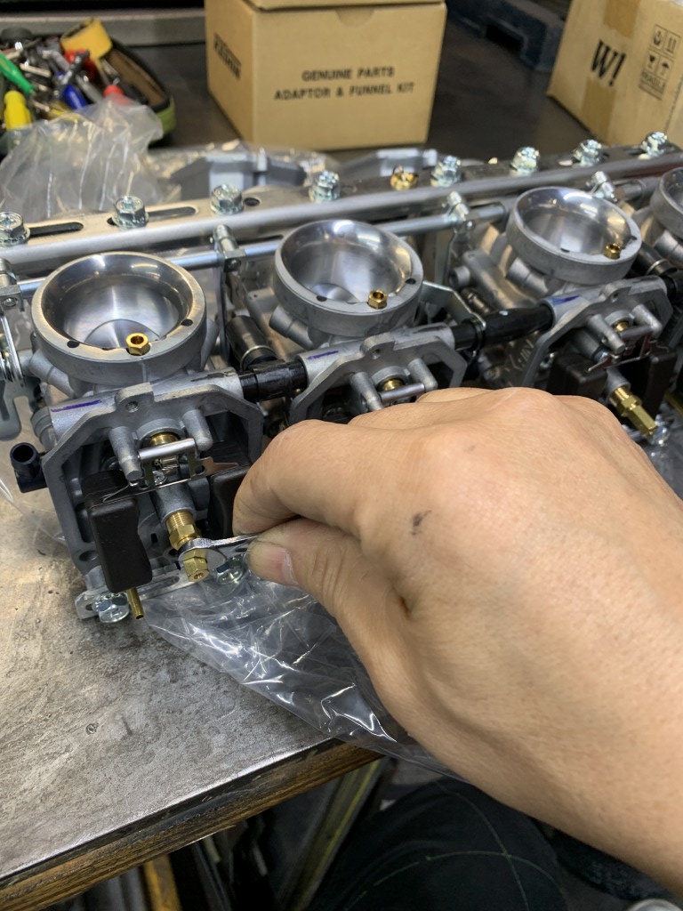 組付け前に内部のセッティングを確認します。ジェット類は一旦緩めて締め直しておくと、セッティングの際に作業性が良くなります。