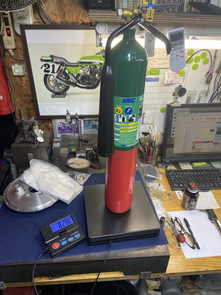硬さの違いを画像で解りやすくするため、ちょうどいいウエイトがありました。こちらの炭酸ガス消火器は約8.3kgです。