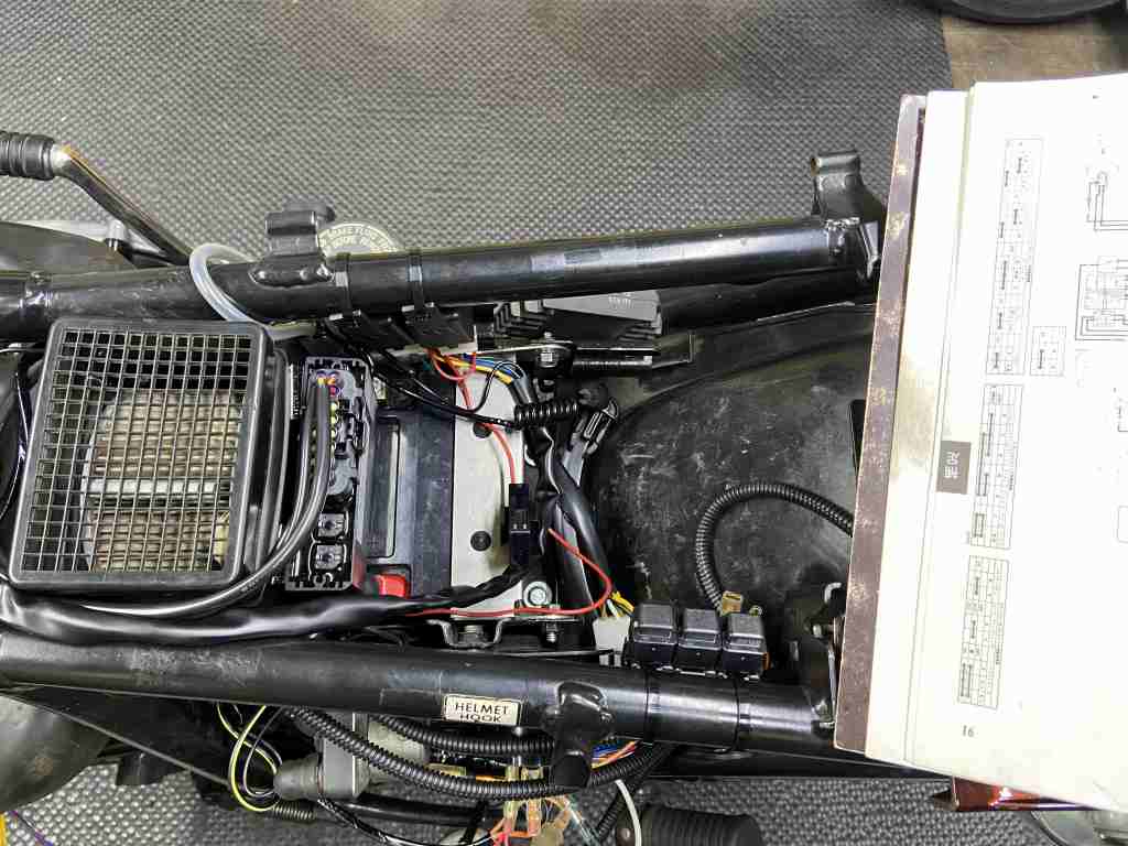 バッテリー周りはこんな感じ。ウオタニSP2のユニット、ヘッドライトリレー、ヒューズBOXが新しい部分。