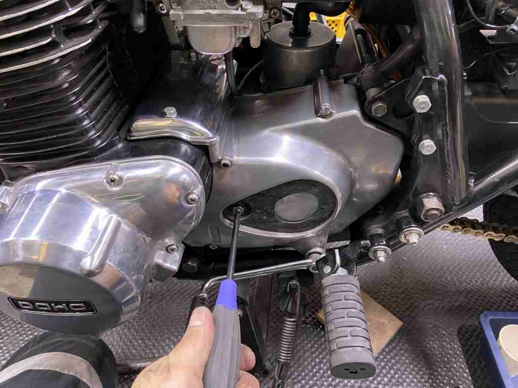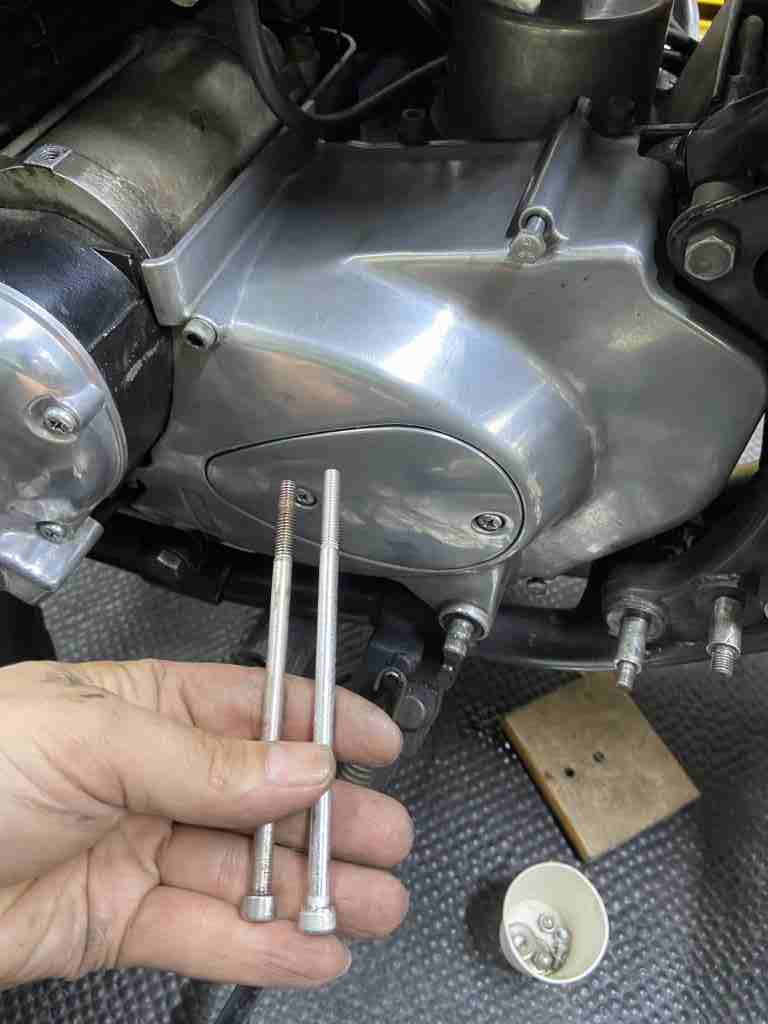 スプロケカバーのボルトは、1本短い物が付いていたので、正規の長さのボルトに変更します。