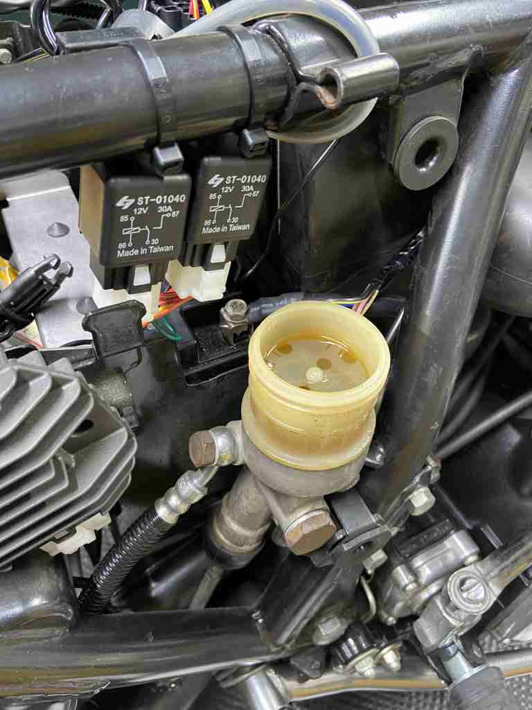 エンジンオイルはだいぶ少ないようで、窓から見えません。1Lくらい補充できました。