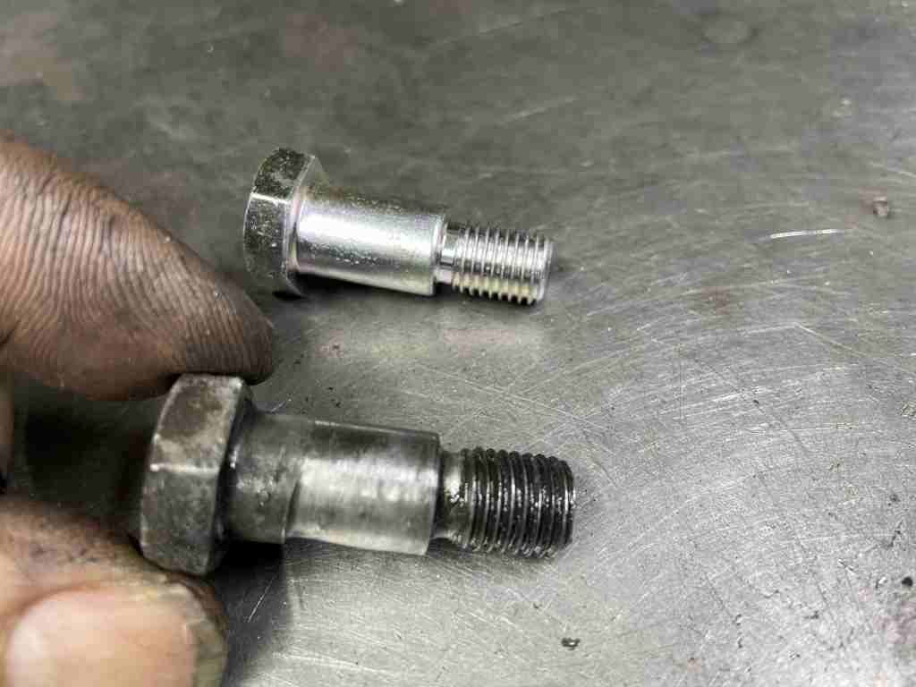 手前が付いていたボルトで、かなり段付き摩耗しています。奥の新品ボルトに交換します。