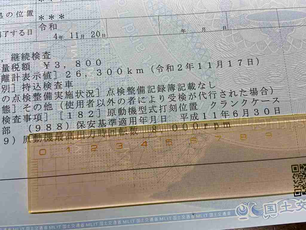 車検自体は問題無く終わりましたが、車体番号が判別しづらいということで、0番コースで再度車体番号を詳しく検査することに。フレームが再塗装されて車体番号が薄くなっているため、正規の書体との確認に手間がかかりましたが無事に合格となりました。次回以降も毎回同じようなことが起こると考えられます。車体番号は鮮明に読めるようにしておく方が賢明です。車体番号が正規と判別できないと判定された場合、車検を拒否されたり職権打刻となったりすることもあります。