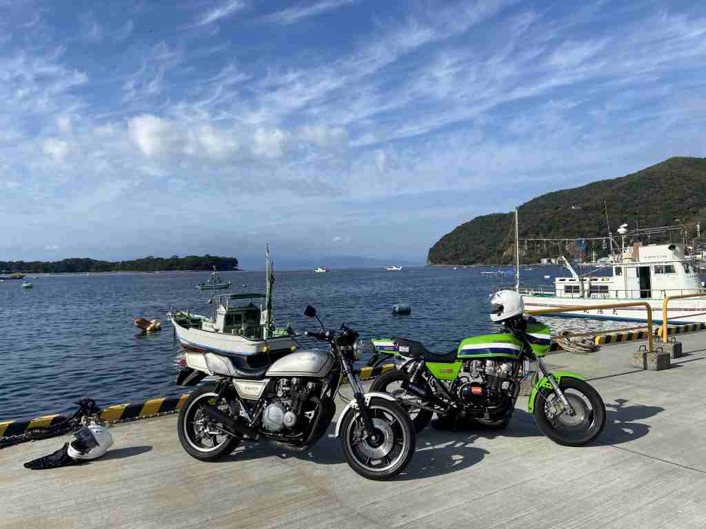 食後は岸壁でまどろみます。今日は気温も高めで風もなく絶好のツーリング日和。