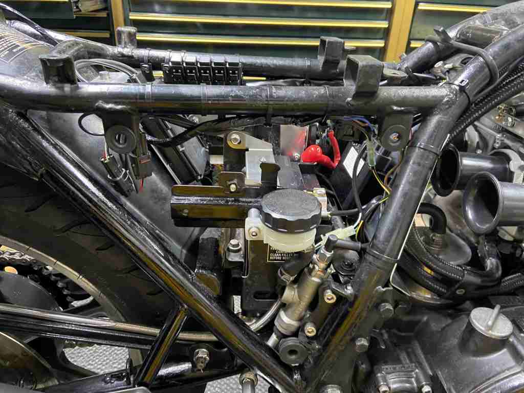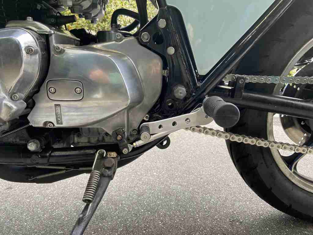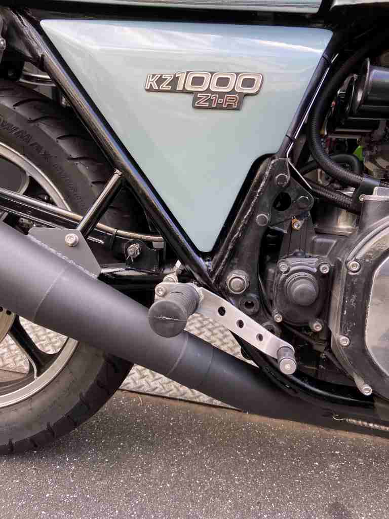 ステップはワークスバックステップVer.2フレーム直付けタイプ。ポジションは低めで膝に優しく、後退量もほどほどで、峠走りからツーリングまでオールマイティーです。
