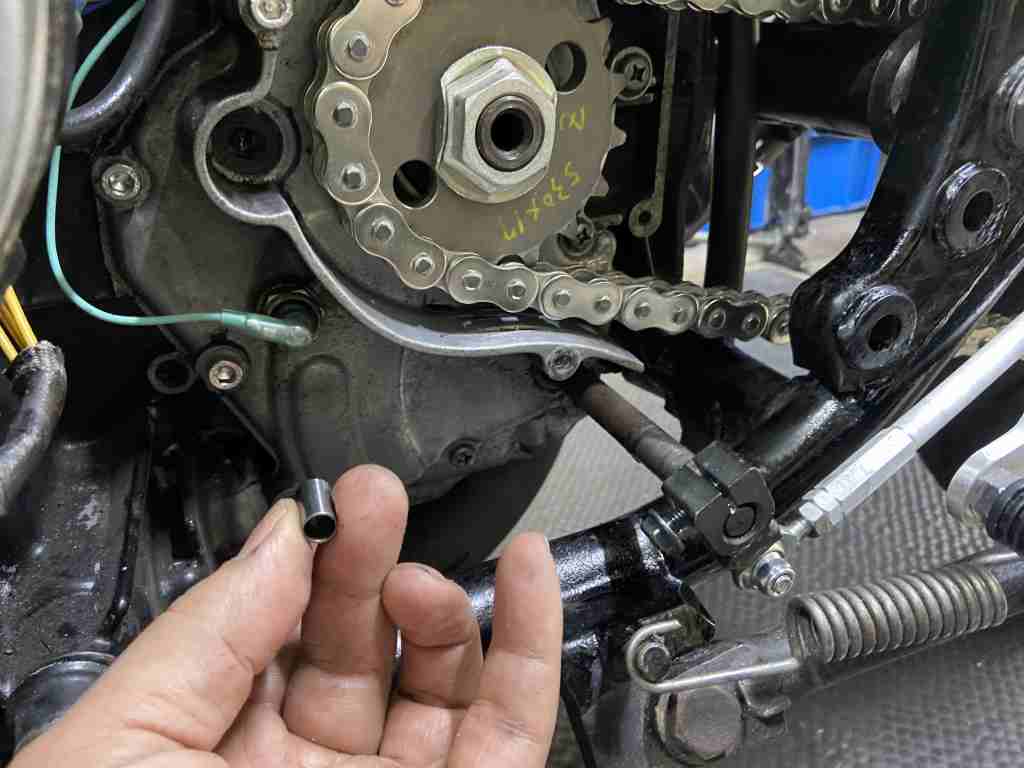 スプロケカバーのダウエルピンが1個欠品していたので前後2個確実に取り付けます。