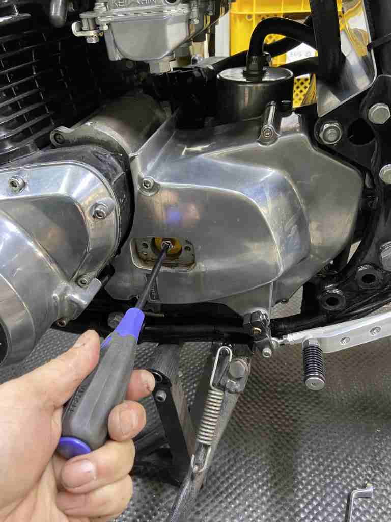 次にレリーズレバーとプッシュロッドのクリアランスを調整します。構造はZ1000Rと同じなので、Z1000Rのマニュアルに従って調整します。Z1RやMk2純正とは逆回転になるので要注意。
