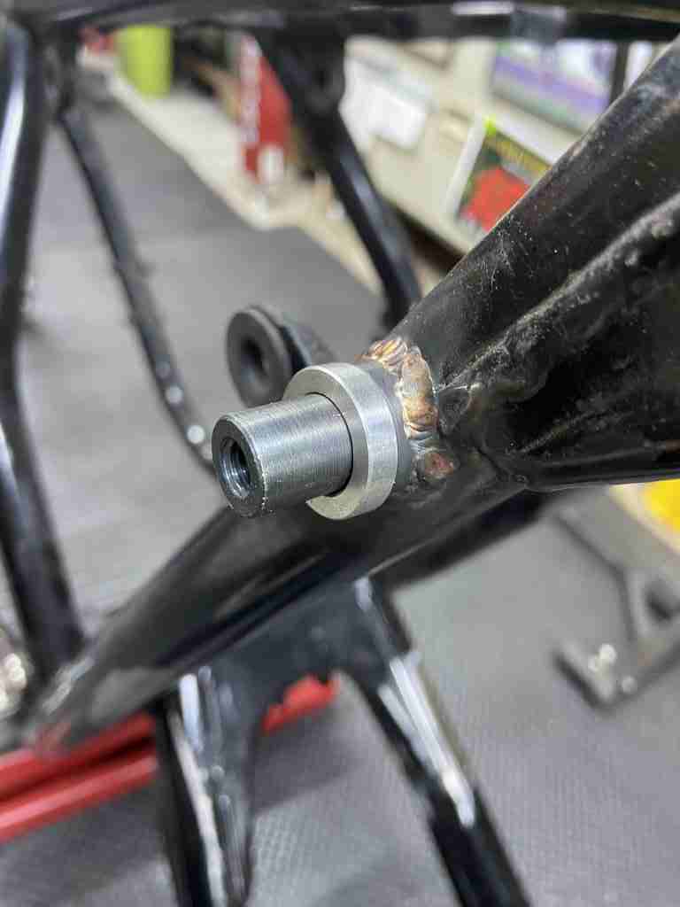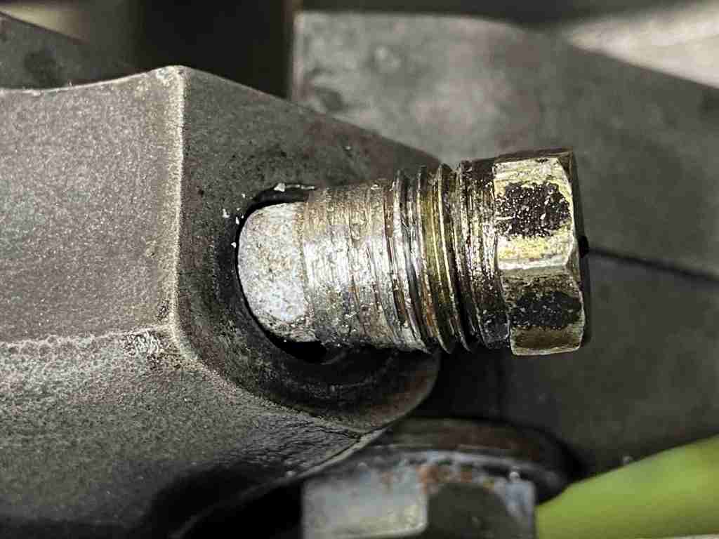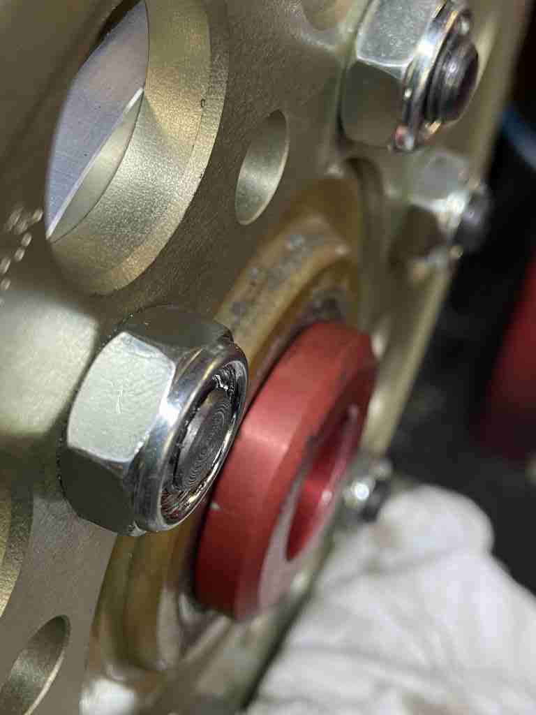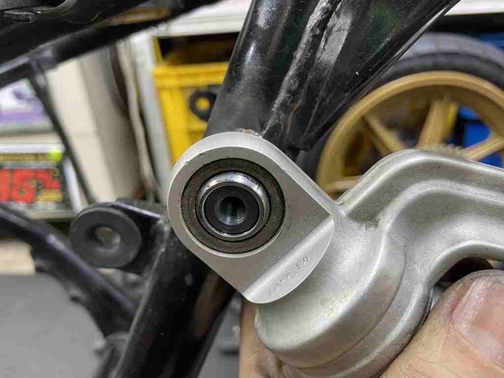 薄型ナットは許容トルクが足りないので、普通の高さのセルフロックナットに交換します。ボルトの突き出し部分はチェーン引きと干渉するので、先端を2ミリほど削ります。