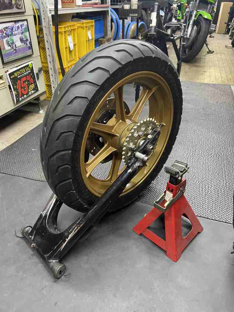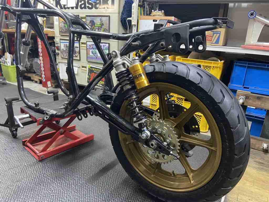 スイングアームとホイール周りを仮組し、各部の配置やクリアランスを確認します。
